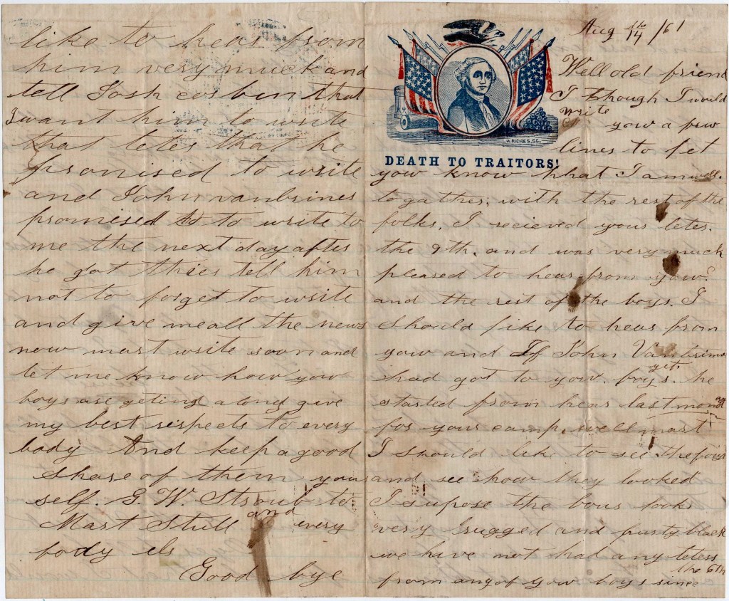 Well, old friend, I thought I would write you a few lines to let you know that I am well together with the rest of the folks. I received your letter the 9th and was very much pleased to hear from you and the rest of the boys. I should like to hear from you and if John Vanbrines had got to you boys yet. He started from here last Monday for your camp.
