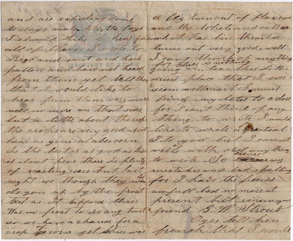 I wrote to Bige and Sant and Hank Patten and have not heard from them yet. Tell them that I would like to hear from them very much. Well, no more on that score but a little about the crops. The crops are very good about here as general Abe’s corn is the best or as good as there is about here. There is plenty of roasting ears but last night we thought they would be gone up by the frost to do any hurt so we had a chance for a crop of corn yet. There was a big turn out of flax seed and the wheat and oats what has been thrashed turns out very good.