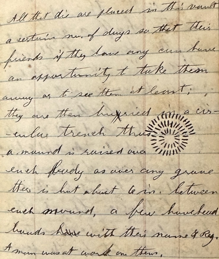 Near the monument is a circular hollow, quite deep, almost a pond though dry. The banks have been marked & formed into terraces. There are three large vaults dug into the bank and stoned up. They are private property, I believe, but one is used as a temporary receptacle of the dead bodies of the soldiers that die here. All that die are placed in this vault a certain number of days so that their friends, if they have any, can have an opportunity to take them away or to see them at least. They are then buried in a circular trench thus [see sketch]. A mound is raised over each body as over any grave. There is but about six inches between each mound. A few have head boards with their names & regiment. A man was at work on them.