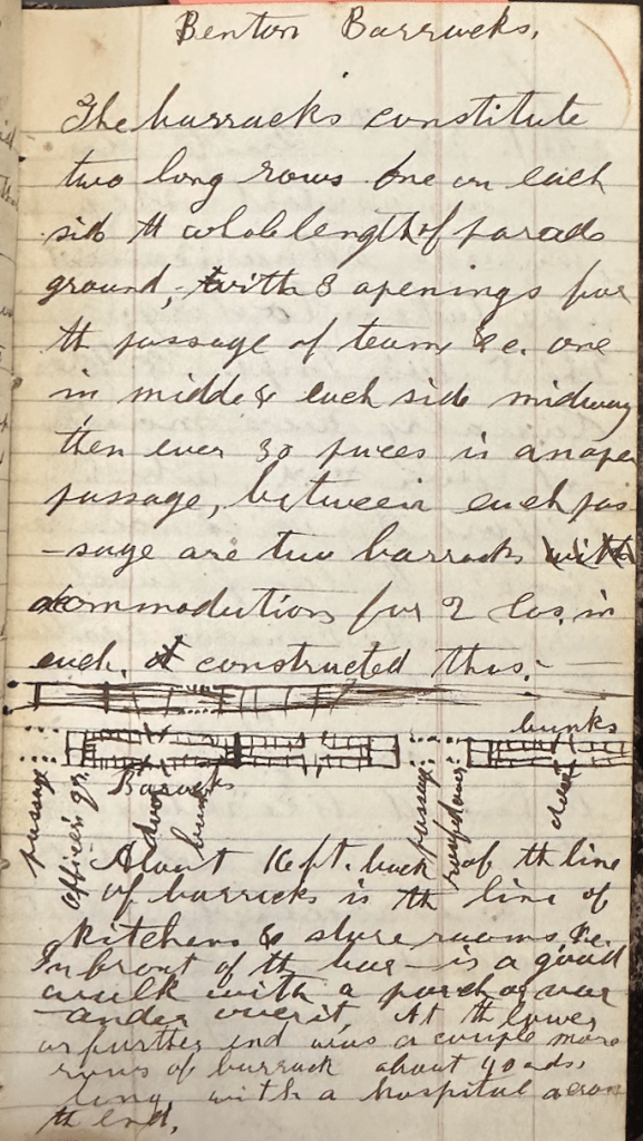 About 16 feet back of the line of barracks is the line of kitchens and store rooms &c. In front of the barracks is a good walk with a porch or veranda over it. At the lower or further end was a couple more rows of barracks about 40 [ ] long with a hospital across the end.