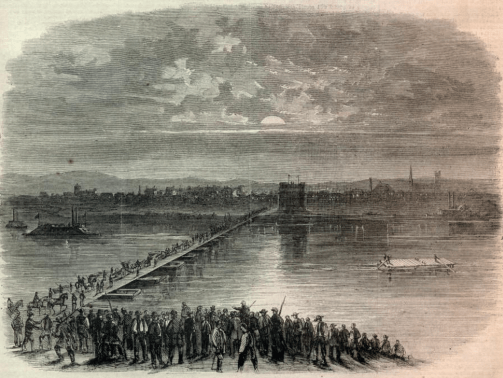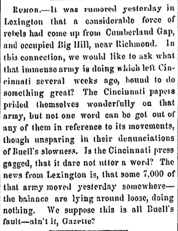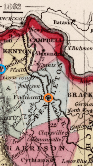 As to the town of Falmouth, I have not seem much of it as yet. In fact, there isn’t much to be seen according to all accounts. Two or three have been out today & say it’s an old dilapidated place & nothing but a little village anyhouse. A railroad [Kentucky Central Railroad] runs by here from Covington & Cincinnati. Goes, I believe, to Lexington. The bridge where it crosses the river is a new temporary concern. The old one was burned by the rebels about two weeks ago as I understand. It was a middling good-sized bridge, being covered, a stone abutment in the center. The new one was finished so that the cars just crossed it today. Learned no particulars.