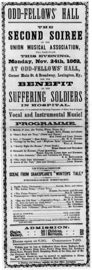 Wednesday, 12th. Early in the morning we heard that the regiment are to march to Nicholasville—a place on the Kentucky River 12 miles distant. A list of the sick were made out. Those worst off to be sent to Lexington Hospital; the rest to be taken along intending to carry a few in the ambulance. I was put down as “doubtful.” In p.m., orders came for everyone not able to walk to be sent to Lexington. Accordingly, a dozen or so with myself were packed off in a couple ambulances. Seven were in the one with me. It was closed up tight as the weather was damp—a little misty rain; a very bad time to expose men. I tried my strength to the utmost to climb into the ambulance. It was very comfortable and easy & I experienced no inconvenience whatever from my ride. A part of the squad was left at the Old College or Hospital No. 2. The measles cases including myself were taken after much delay to the Masonic Hall further in town, or Hospital No. 1. We were placed in Ward No. 5—a room on the ground floor. There were 8 or 10 already in the room from Illinois regiments. They came in day before yesterday—the first that were entered. The hospital was partially opened on the 10th. It had been occupied by the Rebel sick. The last were removed today. The house is very dirty & all in confusion.