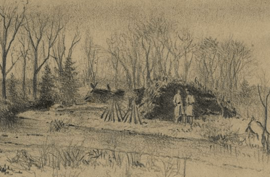 Tuesday, 30th. As it grew dark, we moved our station to the mouth at the breastworks (reverse the reading). We were then reenforced by 2 more men. Two men stand guard at a time. Three turns of relief. Mine last. The night was warm and pleasant. On all the posts where the men expect to stay any time, they erect a sort of shelter to protect them from the direct rays of the sun & from the dew, composed generally of willow bushes, thrown across poles, supported by slender crutches. This constructed, they are but little protection from the cold, but we wrap up in our overcoats & blanket & sleep very comfortable.