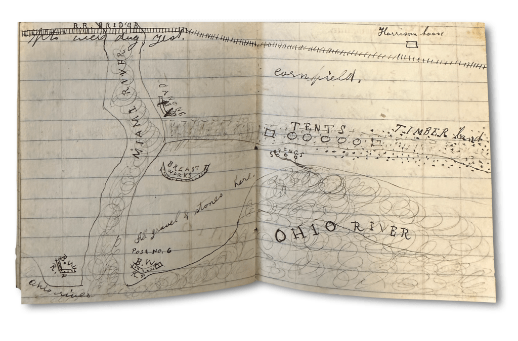 Half past 5 o’clock, I think passing through the town of Lawrenceburg. Seems to be a large place. Buildings mostly brick. [ ] miles to Cincinnati. Growing dark. We are now going slowly along on [ ] bank of the Ohio river. It’s but a few rods below. Only 1/8th as big as I supposed. We have just passed several encampments of soldiers. They are quartered in boarded tents. It actually seems that we are on the eve of a battle. The guerrillas are in marge numbers across the river a few miles.