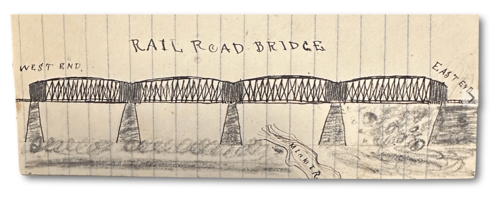 The railroad bridge present a beautiful spectacle from the mouth of Little [Big] Miami river. It’s about half a mile above us.