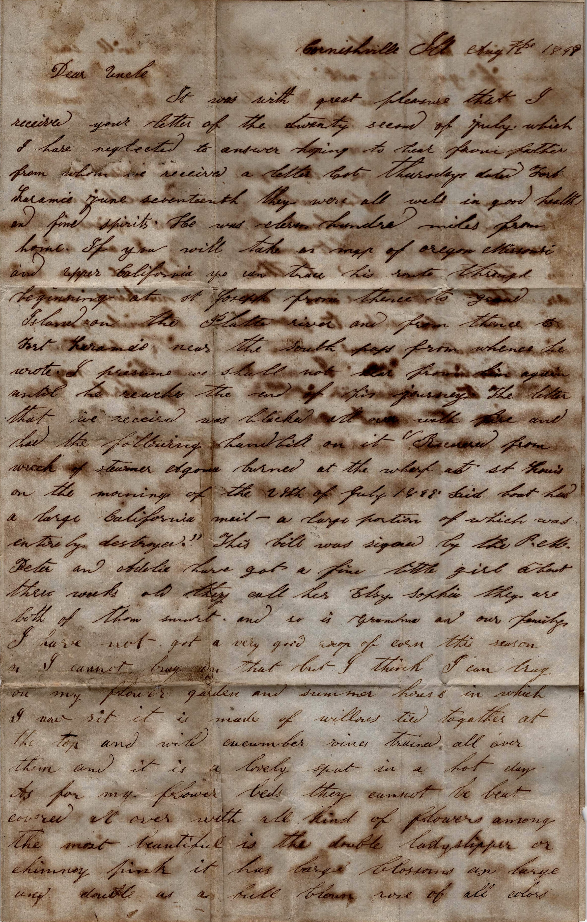 It is with great pleasure that I received your letter from the twenty-second of July which I have neglected to answer hoping to hear from father from whom we received a letter last Thursday dated Fort Laramie, June 17th. They were all well, in good health and fine spirits. He was eleven hundred miles from home. If you will take a map of Oregon, Missouri, and Upper California, you can trace his route through beginning at St. Joseph, from thence to Grand Island on the Platte river, and from thence to Fort Laramie near the South Pass from whence he wrote. I presume we shall not hear from him again until he reaches the end of his journey.