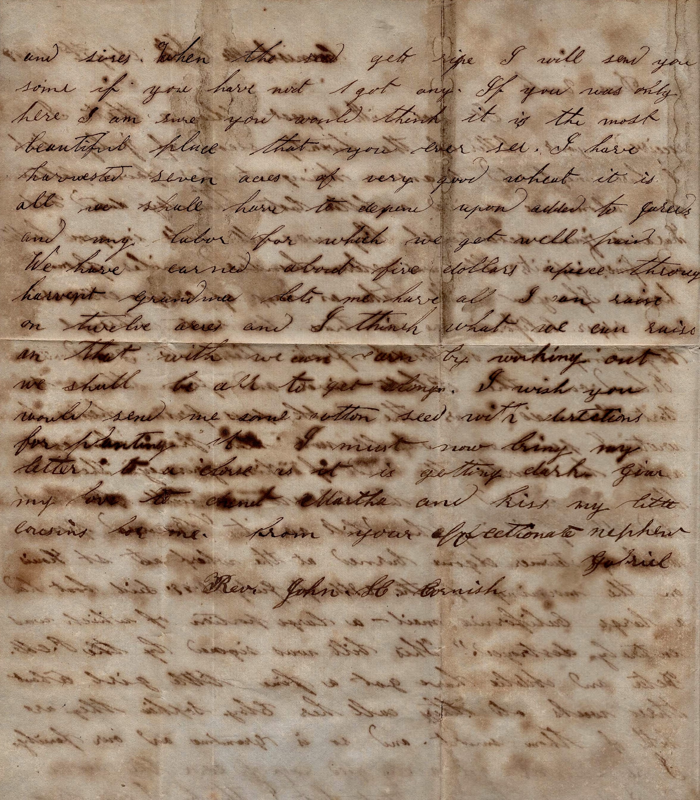 I must now bring my letter to a close as it is getting dark. Give my love to Aunt Martha and kiss my little cousins for me. From your affectionate nephew, — Gabriel