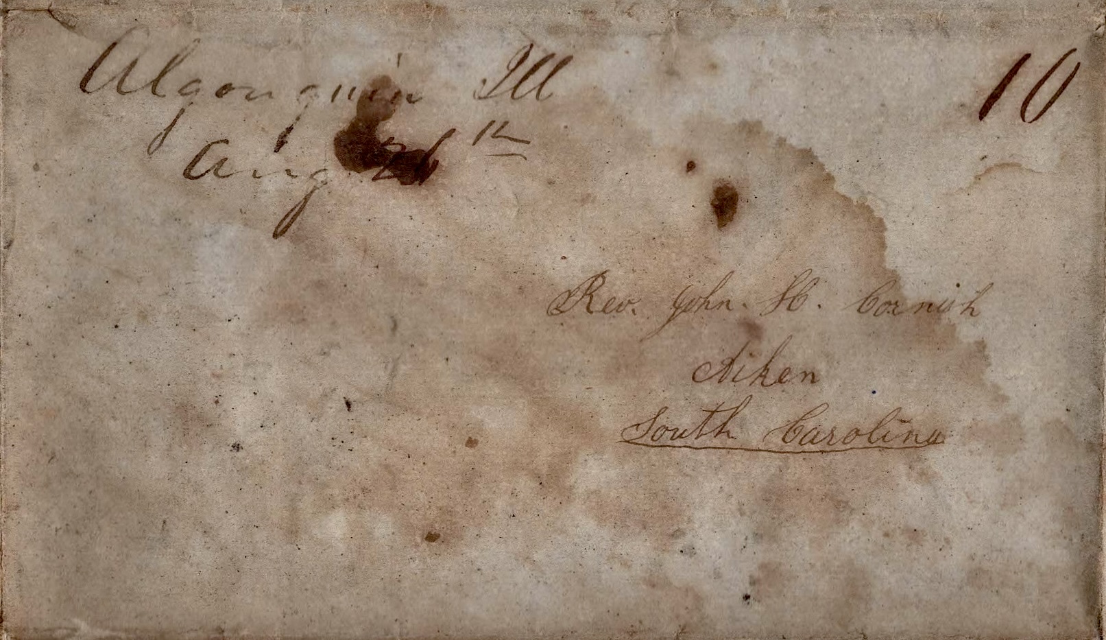 Addressed to Rev. John H. Cornish, Aiken, South Carolina. Postmarked Algonquin, Illinois