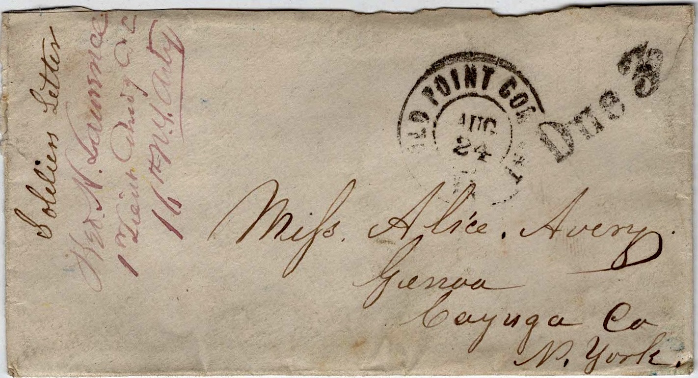 The following letters were written by Simeon Terry Miner (1839-1902) of Geonoa, Cayuga county, New York, while serving as a private, in Co. F, 16th New York Heavy Artillery. He had previously served in Battery I of the 3rd New York Light Artillery. He reenlisted in the 16th “Heavies” in January 1864, imagining perhaps that he would only see garrison duty in some eastern seaboard fortress but Grant broke up this large regiment and chose to use them as infantrymen and in the summer of 1864. He mustered out with the company on 21 August 1865, at Washington, D. C. Simeon was the orphaned son of Edson T. Miner (1804-1848) and Eliza Ann Rich (18xx-1845). He wrote the letters to his cousin, Alice Avery, of Genoa.