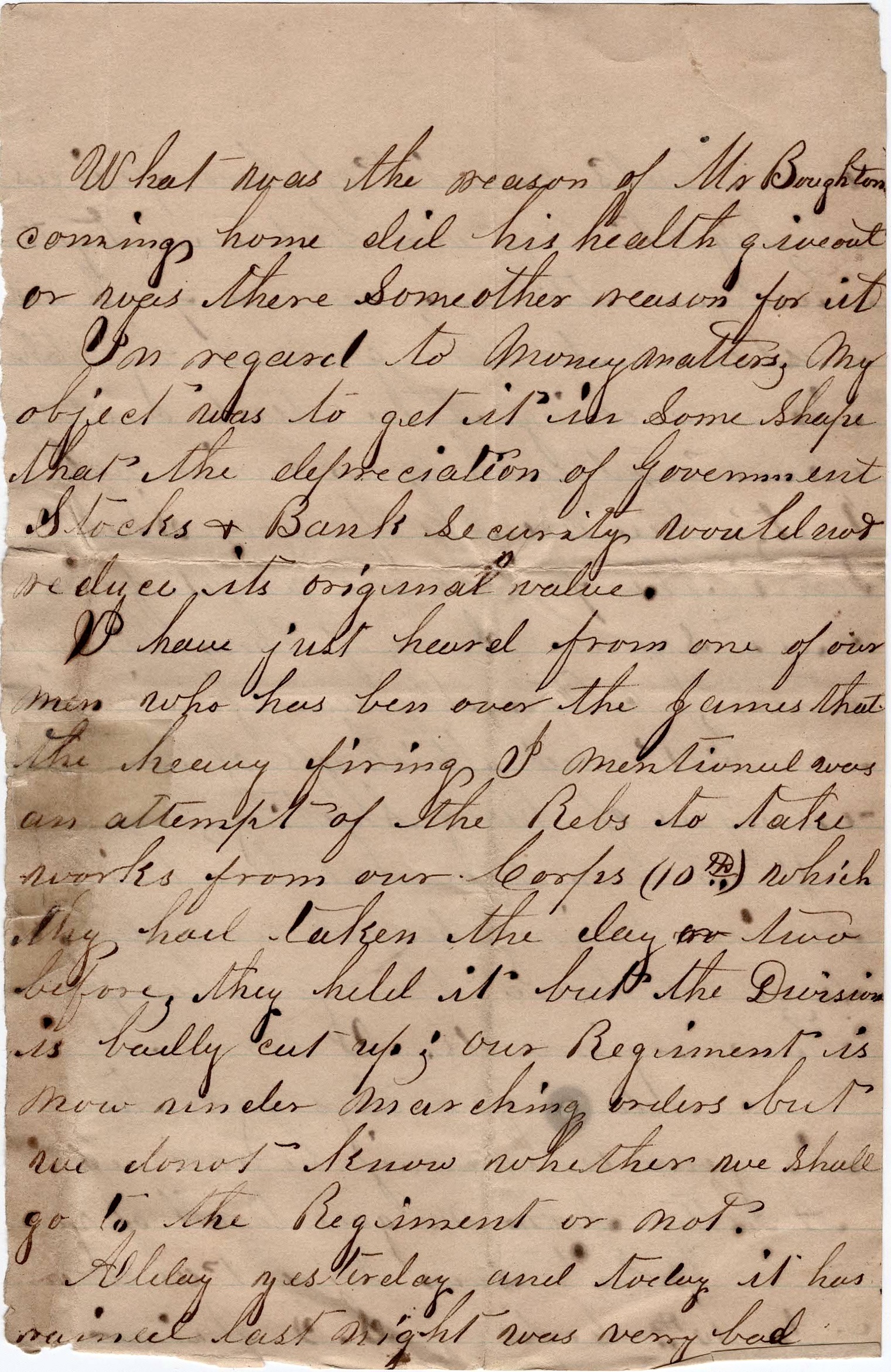 I have just heard from one of our men who has been over the James that the heavy firing I mentioned was an attempt of the Rebs to take works from our Corps (10th) which they had taken the day or two before. They held it but the Division is badly cut up. Our regiment is now under marching orders but we don’t know whether we shall go to the regiment or not.