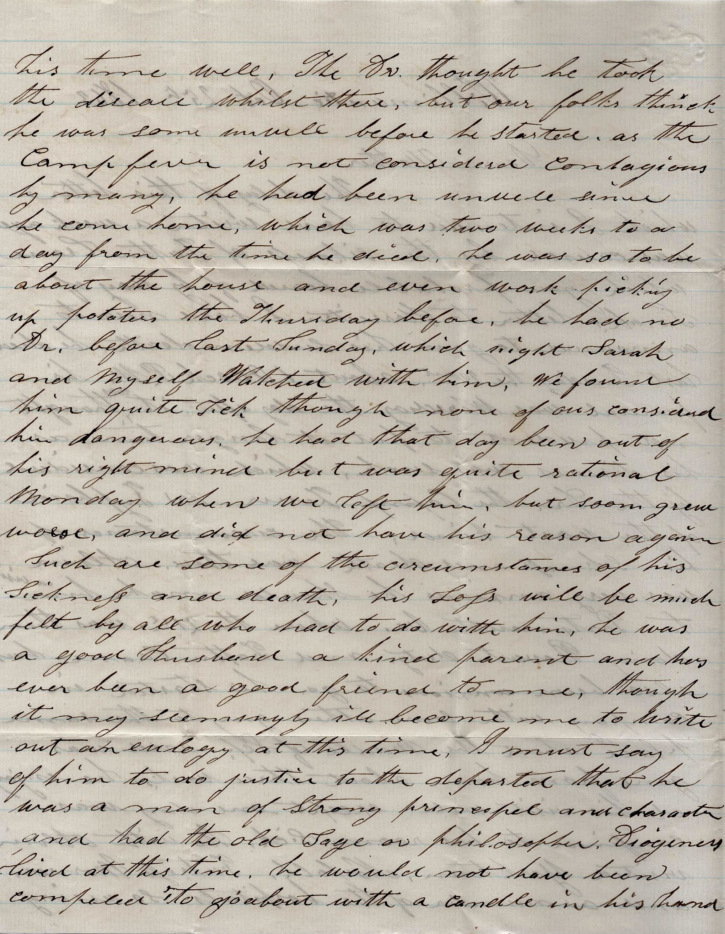 Such are some of the circumstances of his sickness and death. His loss will be much felt by all who had to do with him. He was a good husband, a kind parent, and has ever been a good friend to me. Though it may seemingly ill become me to write out an eulogy at this time, I must say of him to do justice to the departed that he was a man of strong principle and character and had the old sage or philosopher Diogenes lived at this time, he would not have been compelled to go about with a candle in his hand in broad daylight in search of an honest man for no one can rise up and say he was not. And to his great tenacity to what he thought was true and right, I will only quote what was said by the preacher of his funeral discourse: that he was made of that fit kind of material for a martyr.