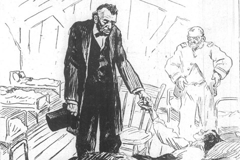 Newspaper drawing depicting Lincoln’s visit to the Depot Field Hospital near City Point, Va. (Courtesy New York State Library)