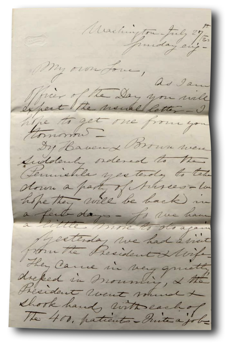 Yesterday we had a visit from the President & wife. 1 They came in very quietly, dressed in mourning, & the President went round & shook hands with each of the 400 patients. Quite a job. 2