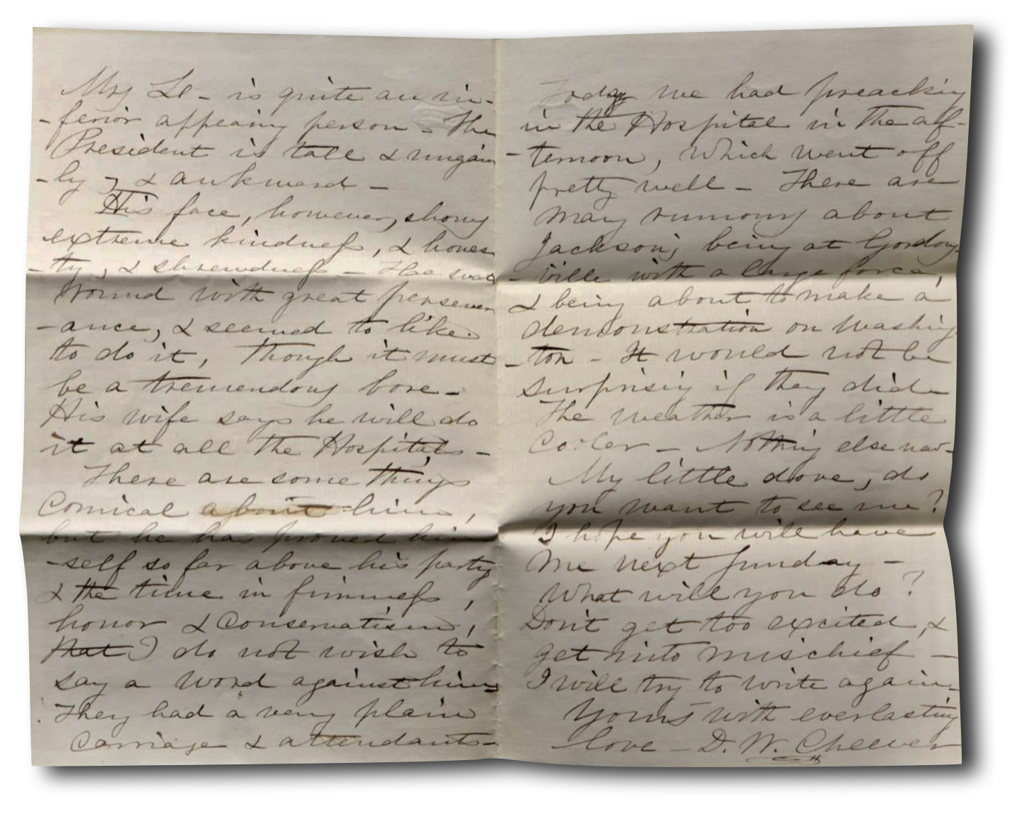 My little dove, do you want to see me? I hope you will have me next Sunday. What will you do? Don’t get too excited & get into mischief. I will try to write again. Yours with everlasting love, — D. W. Cheever