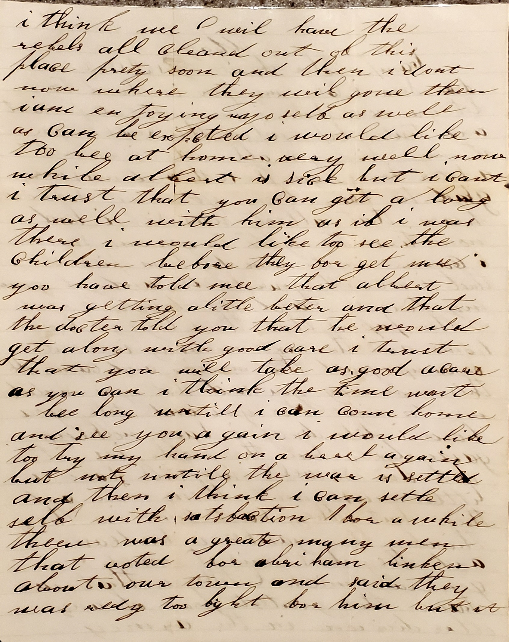 I am enjoying myself as well as can be expected. I would like to be at home very well now while Albert is sick but I can’t. I trust that you can get along as well with him as if I was there. I would like to see the children before they forget me. You have told me that Albert was getting a little better and that the doctor told you that he would get along with good care. I trust that you will take as good a care as you can. I think the time won’t be long until I can come home and see you again. I would like to try my hand on a [ ] again but not until the war is settled and then I think I can settle self with satisfaction. For a while there was a great many men that voted for Abraham Lincoln about our town and said they was ready to fight for him, but it takes them a long time to get at it. I think by the time the war is over, they will be ready to gass about it.