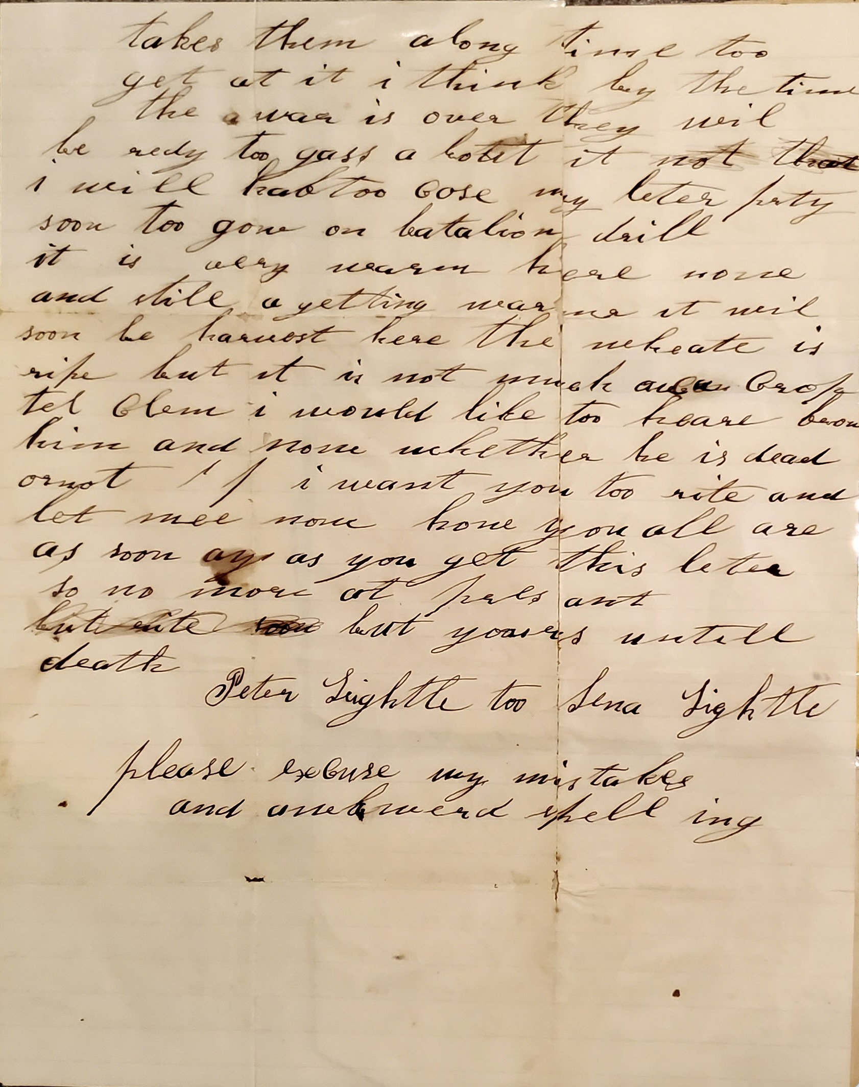 I will have to close my letter pretty soon to go on Battalion Drill. It is very warm here now and still a getting warmer. It will soon be harvest [time] here. The wheat is ripe but it is not much of a crop. Tell Clem [James] I would like to hear from him and know whether he is dead or not. I want you to write and let me know how you all are as soon as you get this letter. So no more at present but [remain] yours until death, — Peter Lightle