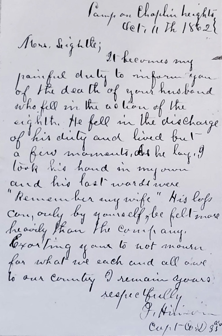 It becomes my painful duty to inform you of the death of your husband who fell in the action of the 8th [at Perryville, Kentucky]. He fell in the discharge of his duty and lived but a few moments. As he lay, I took his hand in my own and his last words were, “Remember my wife.” His loss can, only by yourself, be felt more heavily than the company. Exhorting you to not mourn for what we each and all owe our country, I remain yours respectfully, — J. Hinson, Capt. Co. d, 33rd OVI 1