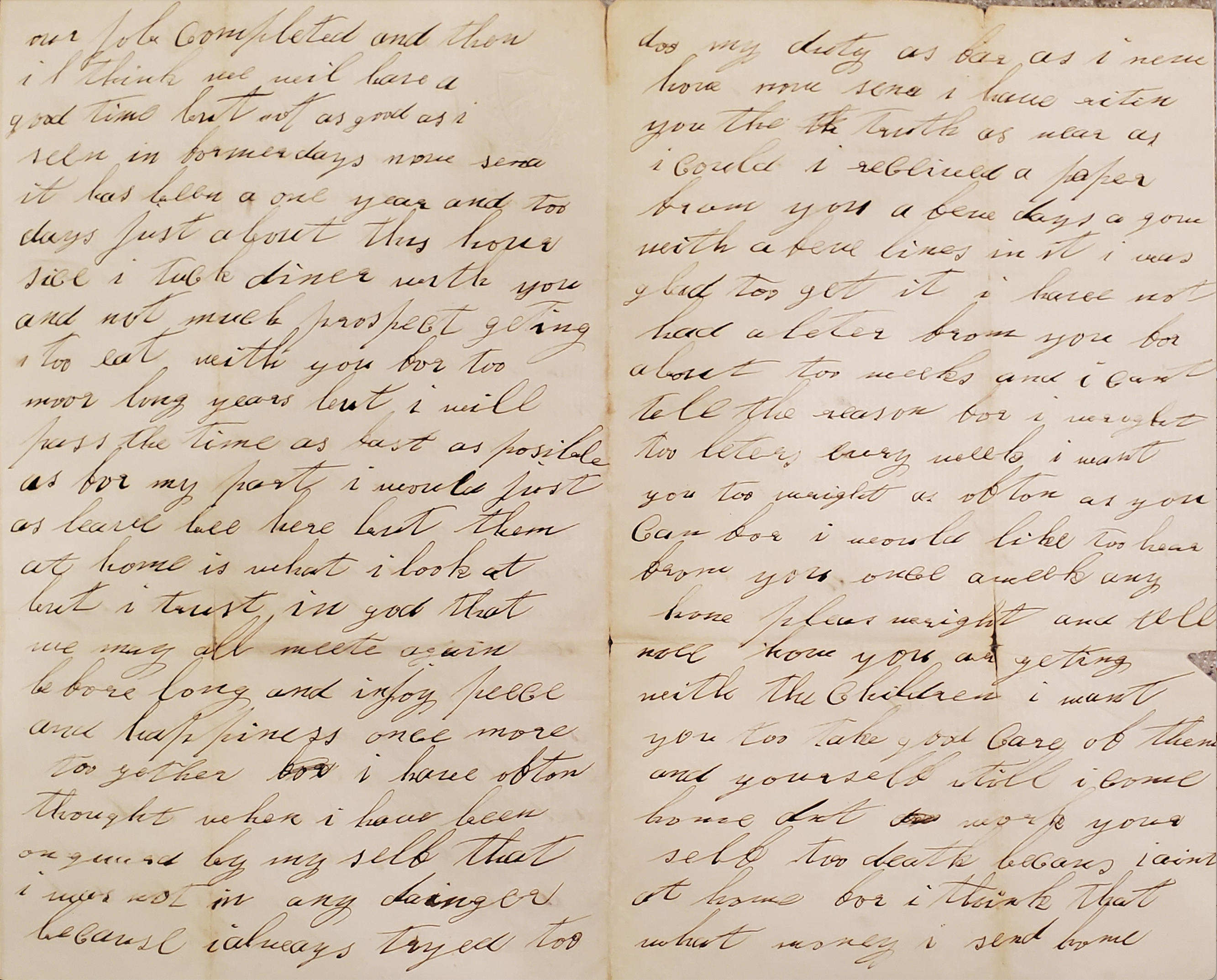 Now Sena, it has been one year and two days [and] just about this hour since I took dinner with you and not much prospect getting to eat with you for two more long years. But I will pass the time as fast as possible. As for my part, I would just as leave be here. But them at home is what I look at. But I trust in God that we may all meet again before long and enjoy peace and happiness once more together. I have often thought when I have been on guard by myself that I was not in any danger because I always tried to do my duty as far as I knew how.