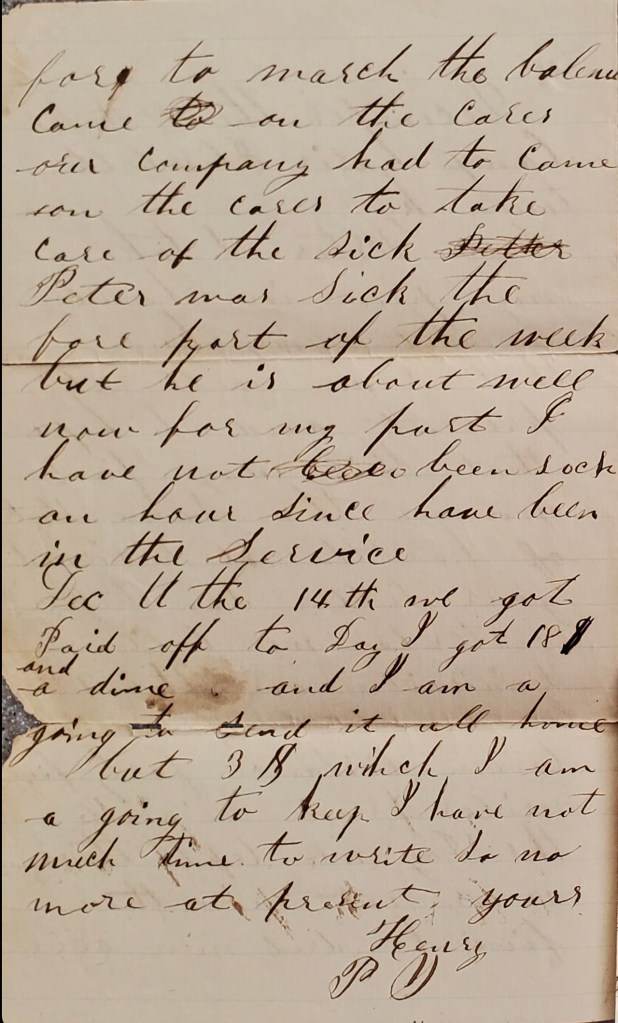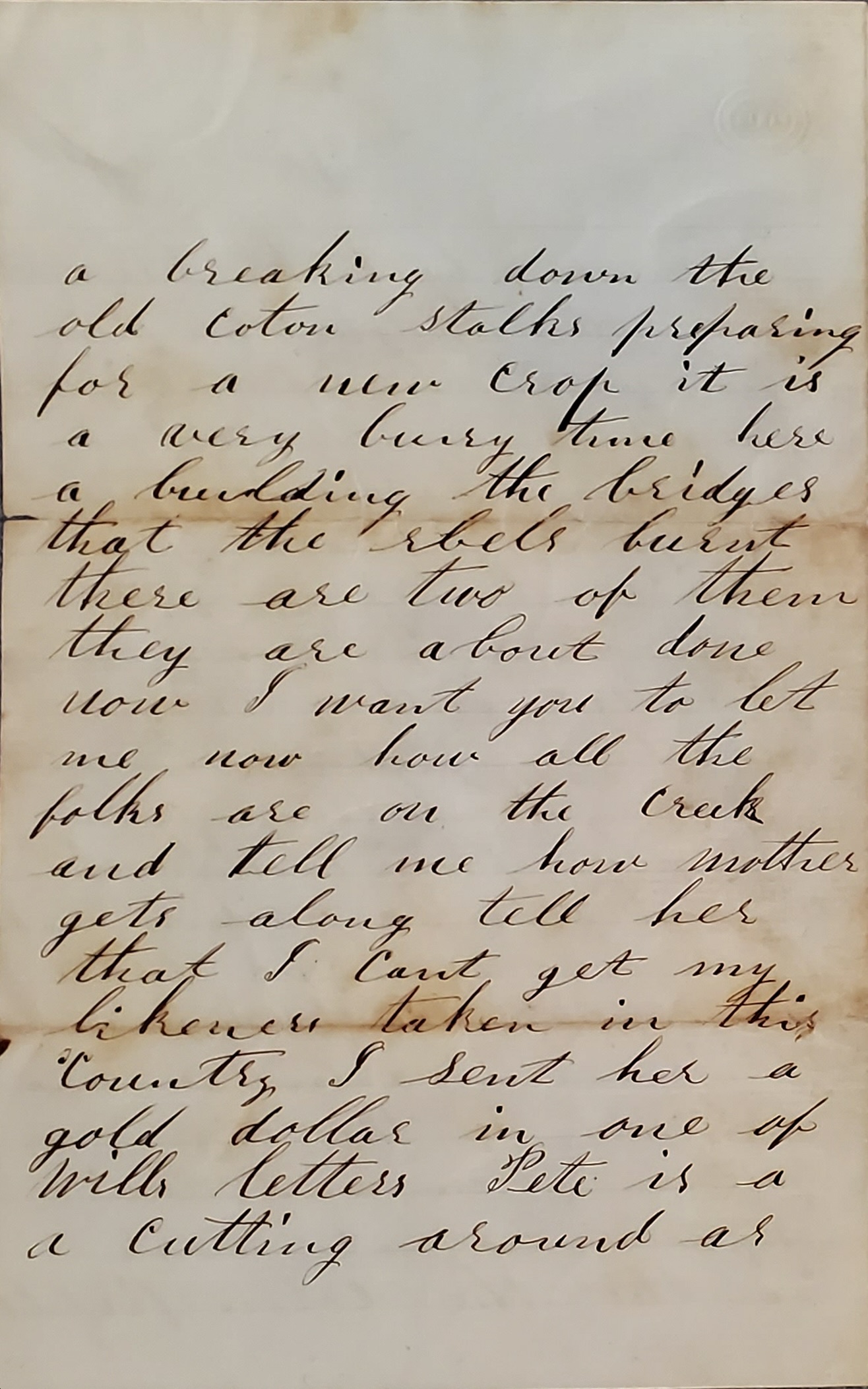 I want you to write and let me know how mother gets along. I want you to let me know how she gets along in every letter you write. I want you to write and let me know how all the folks are on the creek. I have not much more to write so no more at present. Yours, — Henry