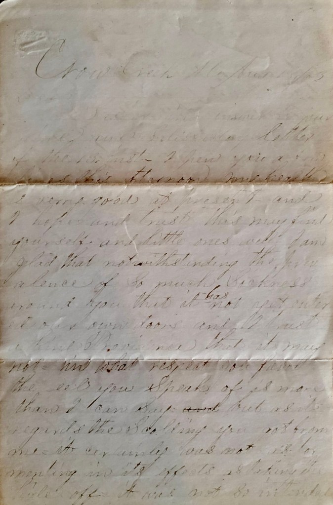 I pen you a few lines this afternoon. My health is very good at present and I hope and trust this may find yourself and little ones well. I am glad that notwithstanding the prevalence of much sickness around you that it has not yet entered our own doors and I trust a kind Providence that it may not. In what respect you favor the eel [?] you speak of is more than I can say, but as it regards the scolding you got from me, it certainly was not as tormenting in its effects as taking the hide off. It was not so intended. At least its effects were very gratifying—it brought you and Rachel both out. I give her a little [scolding] also and at last I heard another tune that pleased me better than Morgan. As to an apology, you need never to have mentioned it because I have got to be one of the best natured individuals in the world.