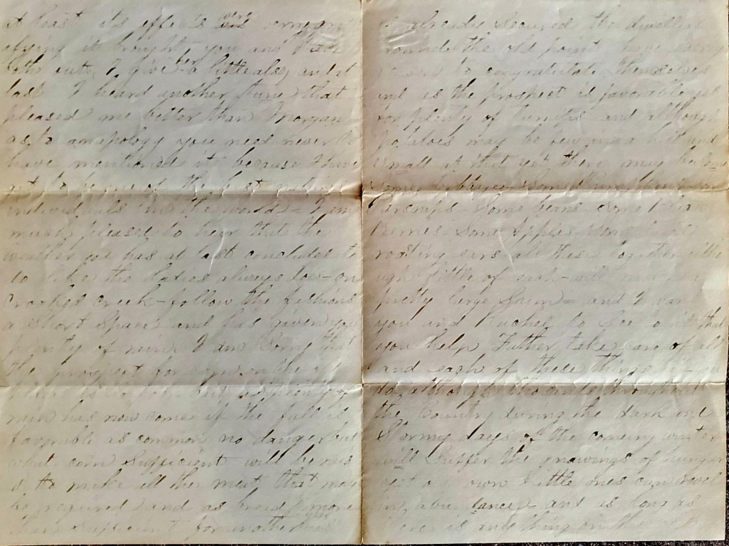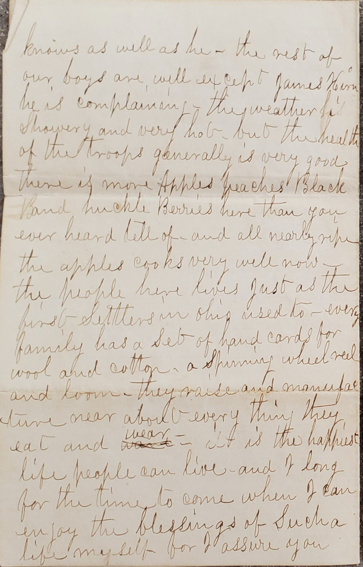 I am much pleased to hear that the weather god has at last concluded to do like the ladies always does on Crooked Creek—follow the fashions a short space and has given you plenty of rain. I am sorry that the prospect for corn on the old place is so poor. But as plenty of rain has now come, if the fall is favorable as common, no danger but what corn sufficient will be raised to make all the meat that may be required and as bread more than sufficient for another year is already secured. The dwellers around the old point have every reason to congratulate themselves and as the prospect is favorable yet for plenty of turnips and although potatoes may be few in a hill and small at that, yet there may be some cabbage, some plump hens, some parsnips, some beans, some blackberries, some apples, some dried roasting ears [and] all these together—although little of each—will make a pretty large sum. I want you and Rachel to see to it that you help father take care of all and each of these things. If you do, although thousands throughout the country during the dark and stormy days of the coming winter, will suffer the gnawings of hunger, yet our own little ones can revel in abundance. As long as there is anything on the old place to eat, it is my desire that yourself and little ones shall have part of it.