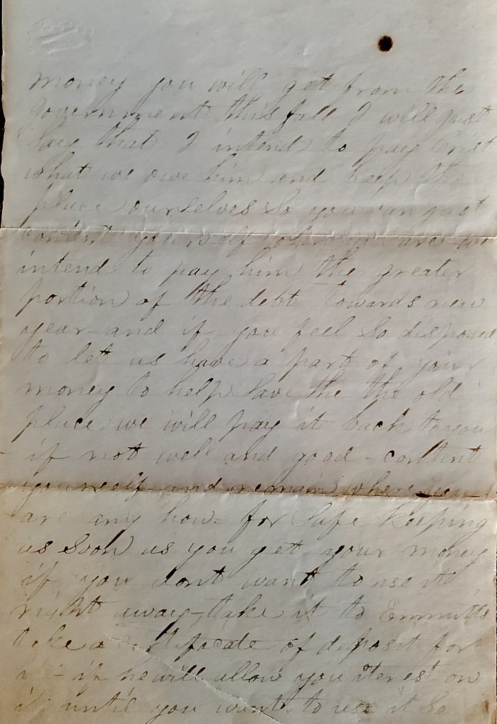 Dear sister, since you asked my advice as to what would be the best for you to do with the money you will get from the government this fall, I will just say that I intend to pay Crist what we owe him and keep the place ourselves. So you can just content yourself where you are. We intend to pay him the greater portion of the debt towards new year, and if you feel so disposed to let us have a part of your money to help save the old place, we will pay it back to you if not well and good. Content yourself and remain where you are anyhow. For safe keeping as soon as you get your money, if you don’t want to use it right away, take it to Emmitt’s. Take a certificate of deposit for it. If he will allow you interest on it until you want to use it, so much the better. If not, leave it anyhow. It will be the safest there. I have wrote you a long letter so l will close by requesting you to write often. I ever remain your true friend and brother, — William