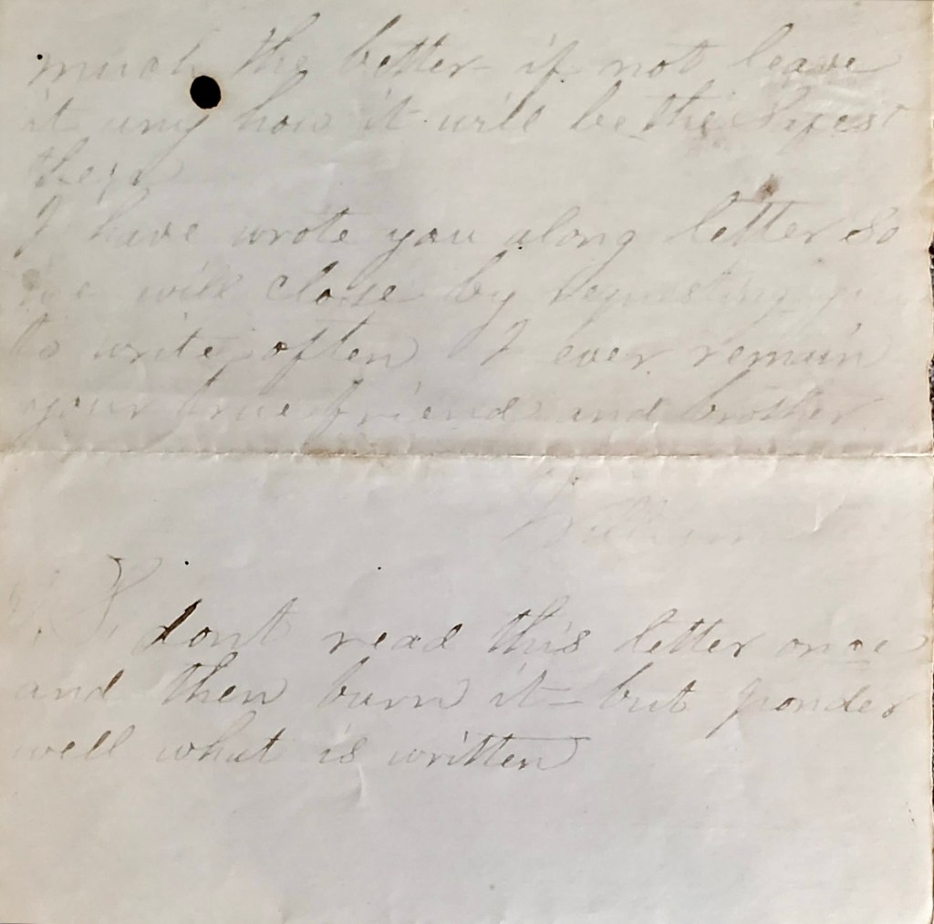 Well, for fear you will get as tired reading this as I am writing it, I guess I had better stop right here. Write often all the news—especially about the Sparks. Ever your true friend and brother, — William