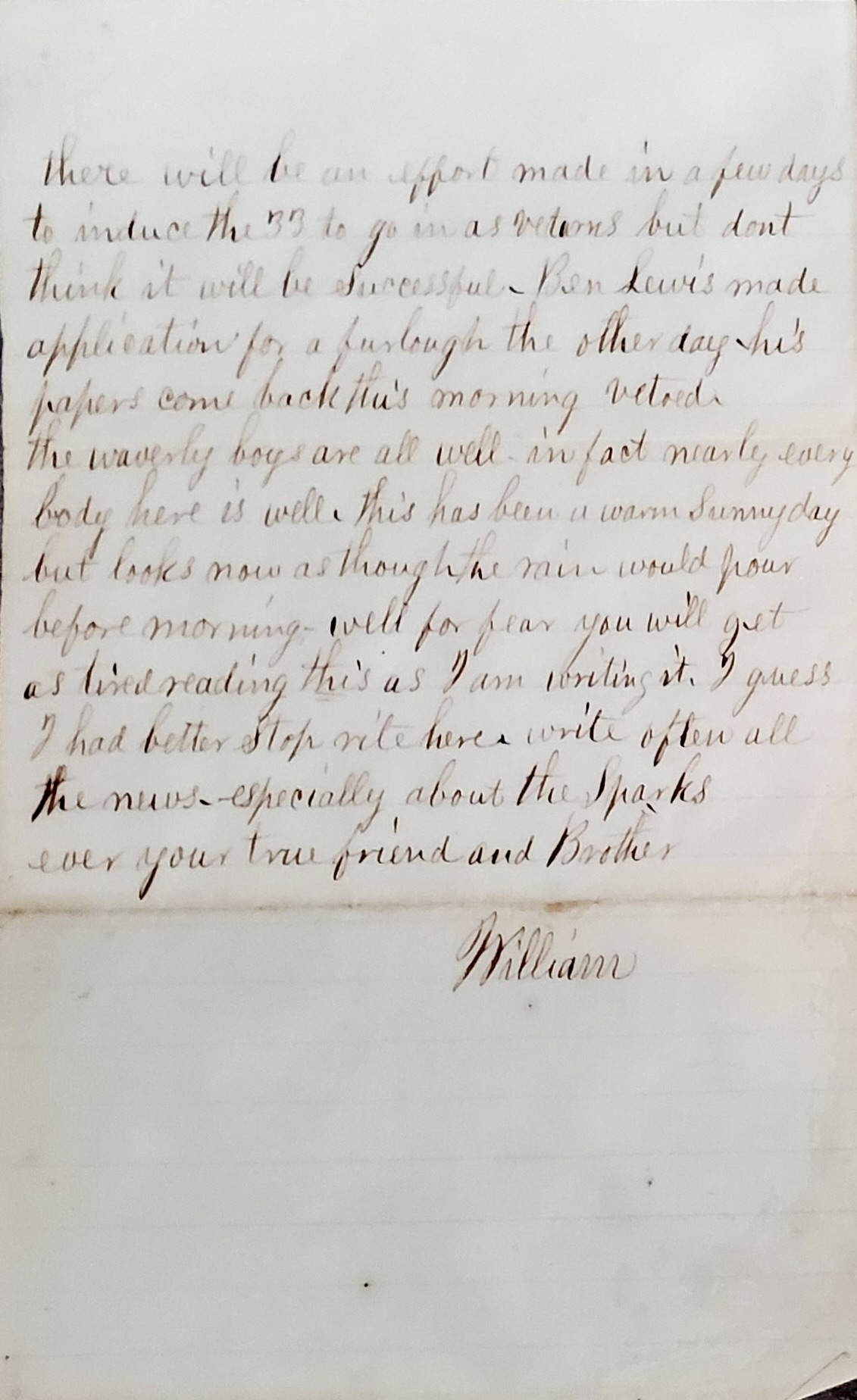 There will be an effort made in a few days to induce the 33rd [Ohio] to go in as veterans but don’t think it will be successful. Ben Lewis made application for a furlough the other day. His papers came back this morning vetoed. The Waverly boys are all well. In fact, nearly everybody here is well. This has been a warm, sunny day but looks now as though the rain would pour before morning.