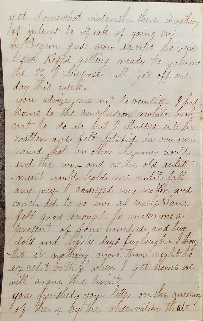 You advised me not to reenlist. I had come to that conclusion a while back not to do so, but I studied into the matter and felt satisfied in my own mind that another summer would end the war, and as the old enlistment would hold me until fall anyway, I changed my notion and concluded to go in. As Uncle Sam felt good enough to make me a present of four hundred adn two dollars and thirty days furlough, I thought it nothing more than right to accept both. When I get home, we will argue the point.
