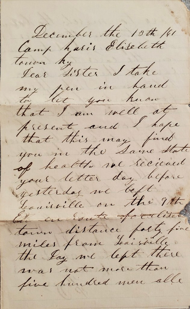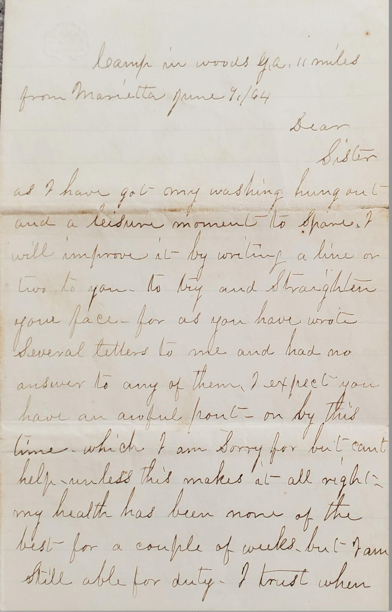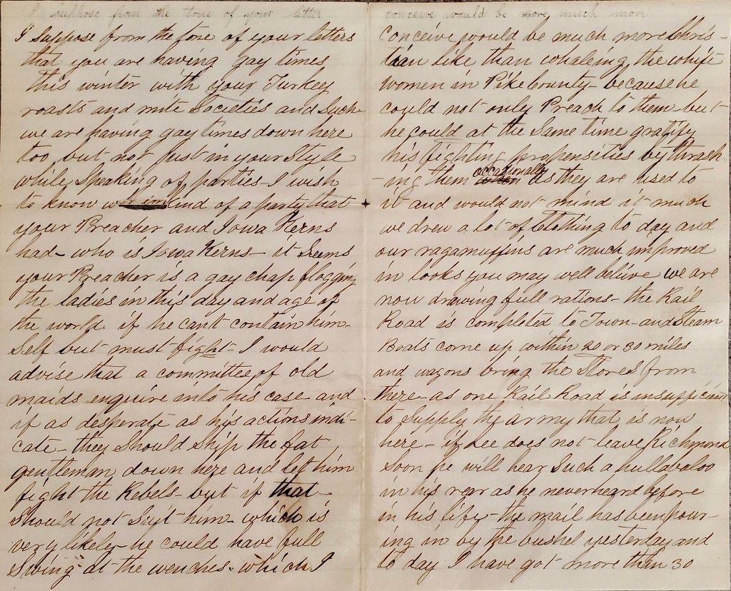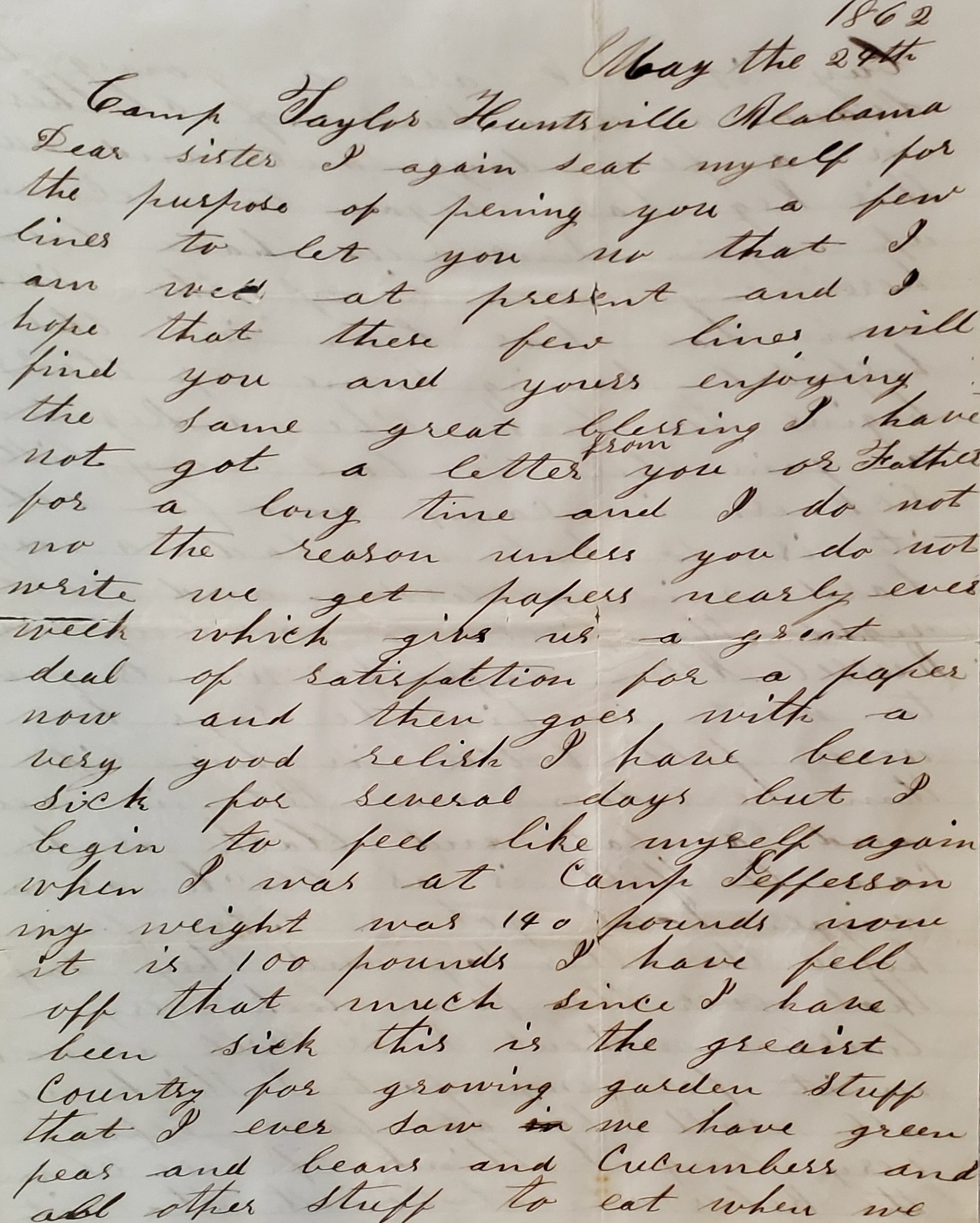 In answer to your kind favor of the 20th, I pen you a few lines tonight. I had begun to think that all my friends in Pike county except Rachel had forsaken me. But night before last, I was undeceived. The letters just poured in. I sat for about two hours and read letters and felt as clever as ever Aunt Sallie did in a Methodist lovefeast. You tried to excuse yourself by saying the reason you didn’t write was that there was nothing to write about. I accept no such excuses for there was something to write about. You were all alive and well, were you not? You could have wrote and told me that certainly. And I assure you, nothing could be written that would interest me so much as that. Just let me know that are all are well at home and I can get along very well. Of course I like to hear all of the news, but I want you to make this the last time that, like Macabre, you wait for something to turn up before you write. 1