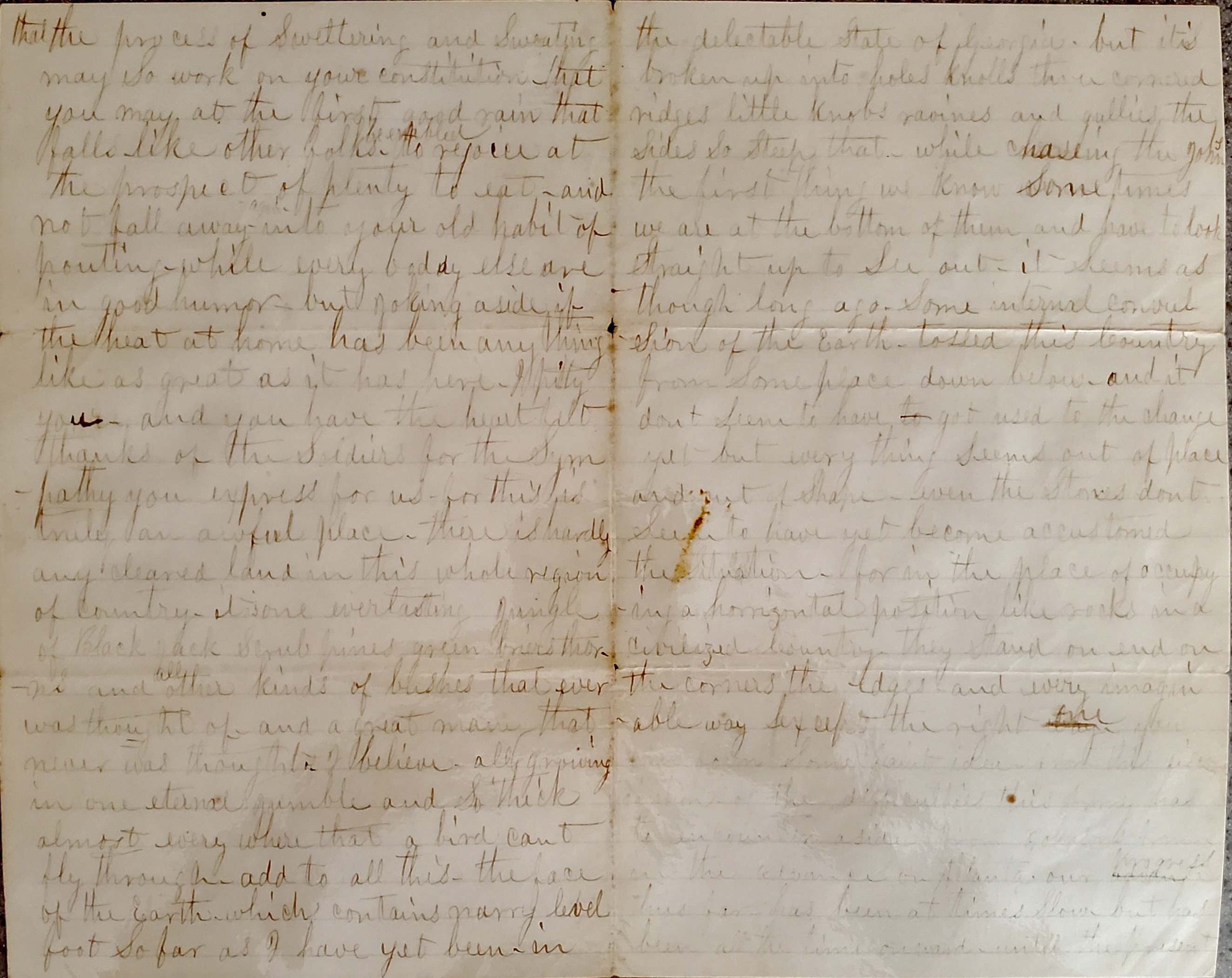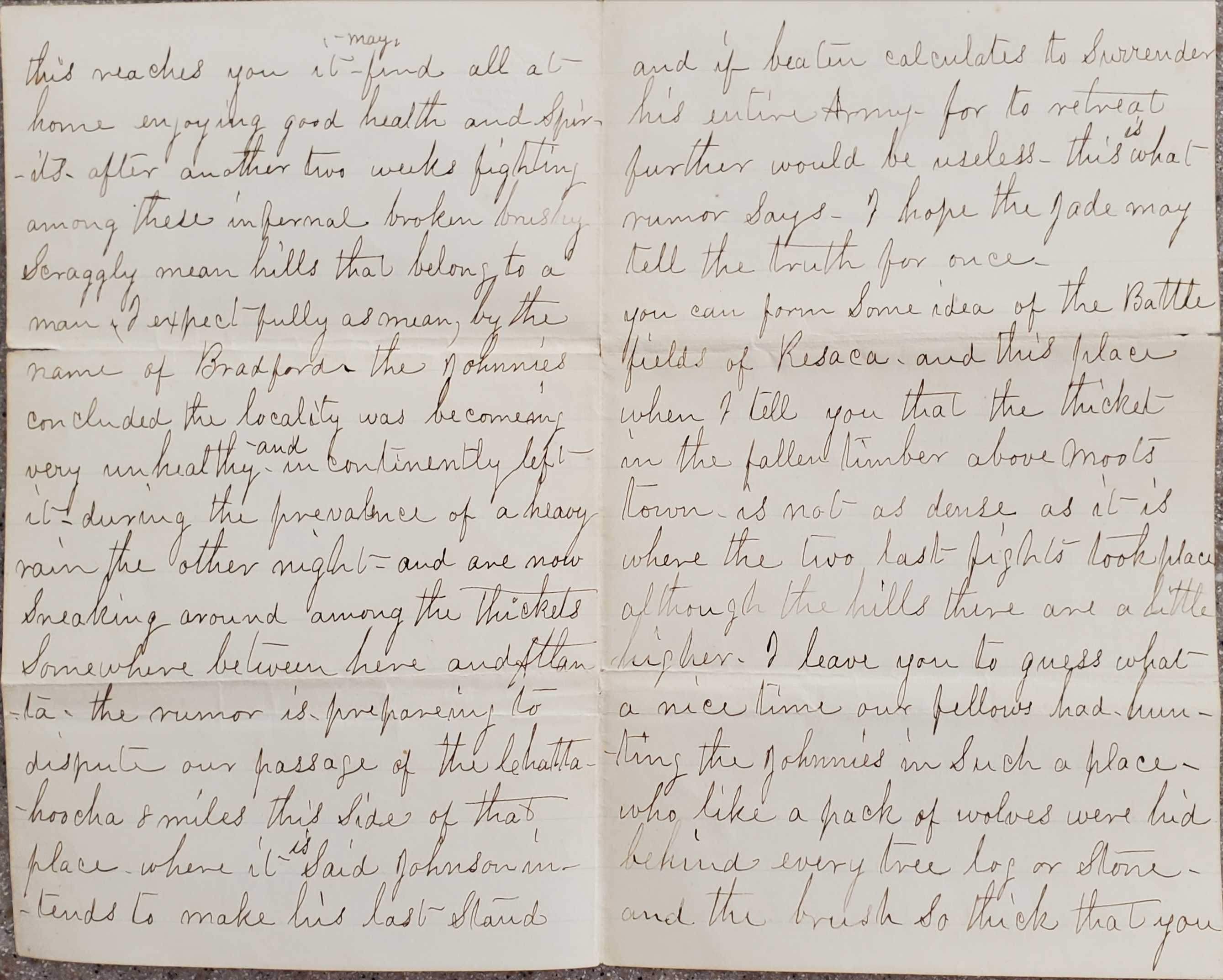 After another two weeks fighting among these infernal broken, brushy, scraggly mean hills that belong to a man—I expect fully as mean—by the name of Bradford, the Johnnies concluded the locality was becoming very unhealthy and incontinently left it during the prevalence of a heavy rain the other night and are now sneaking around among the thickets somewhere between here and Atlanta. The rumor is [they are] preparing to dispute our passage of the Chattahoochee [river] this side of that place where it is said Johnston intends to make his last stand, and, if beaten, calculates to surrender his entire army for to retreat further would be useless. This is what rumor says. I hope the jade may tell the truth for once.