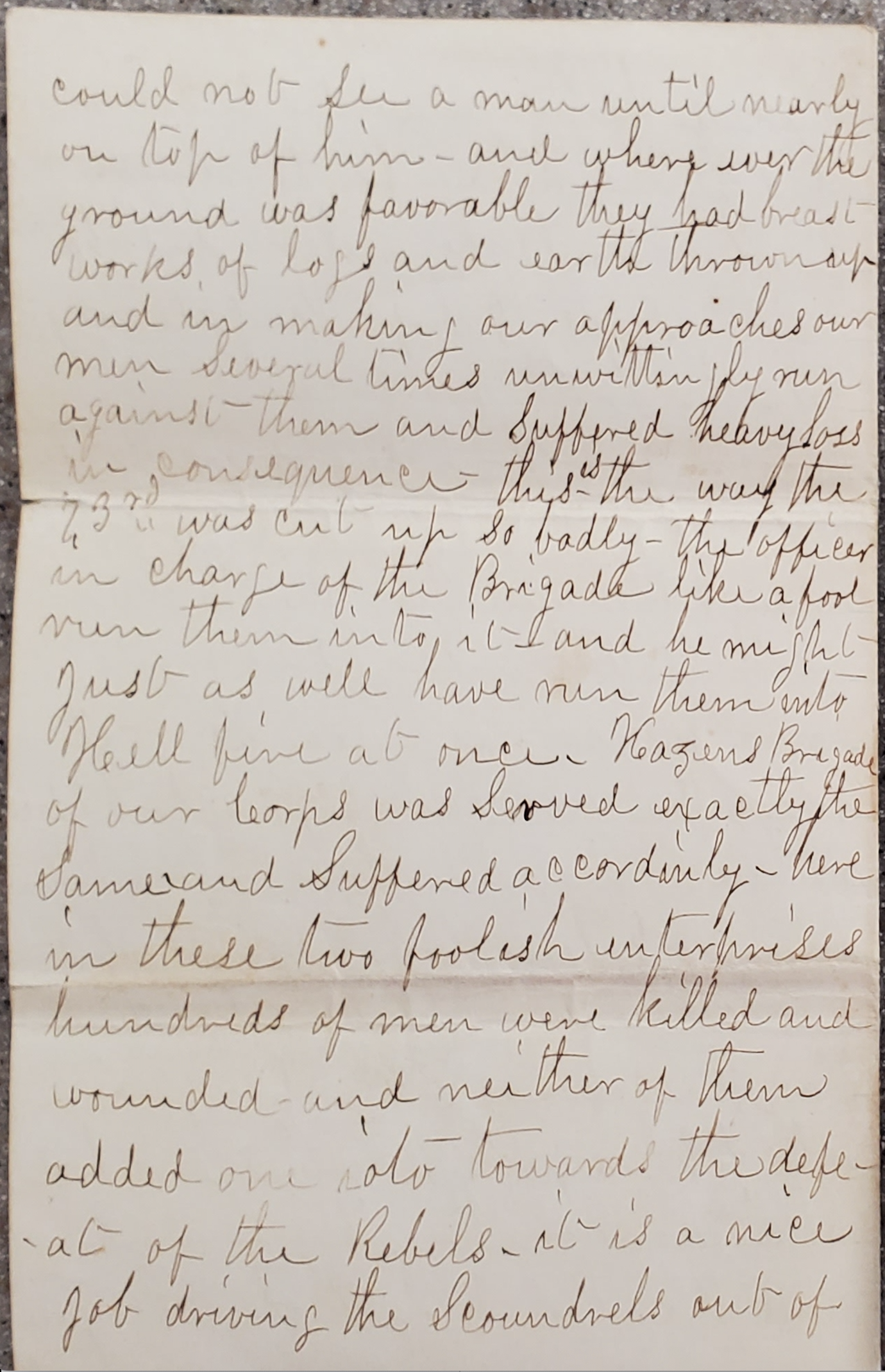Hazen’s Brigade of our Corps was served exactly the same and suffered accordingly. Here in these two foolish enterprises hundreds of men were killed and wounded and neither of them added one iota towards the defeat of the Rebels. It is a nice job driving the scoundrels out of these places as well as a work of time, but our fellows goes at it like working by the month.