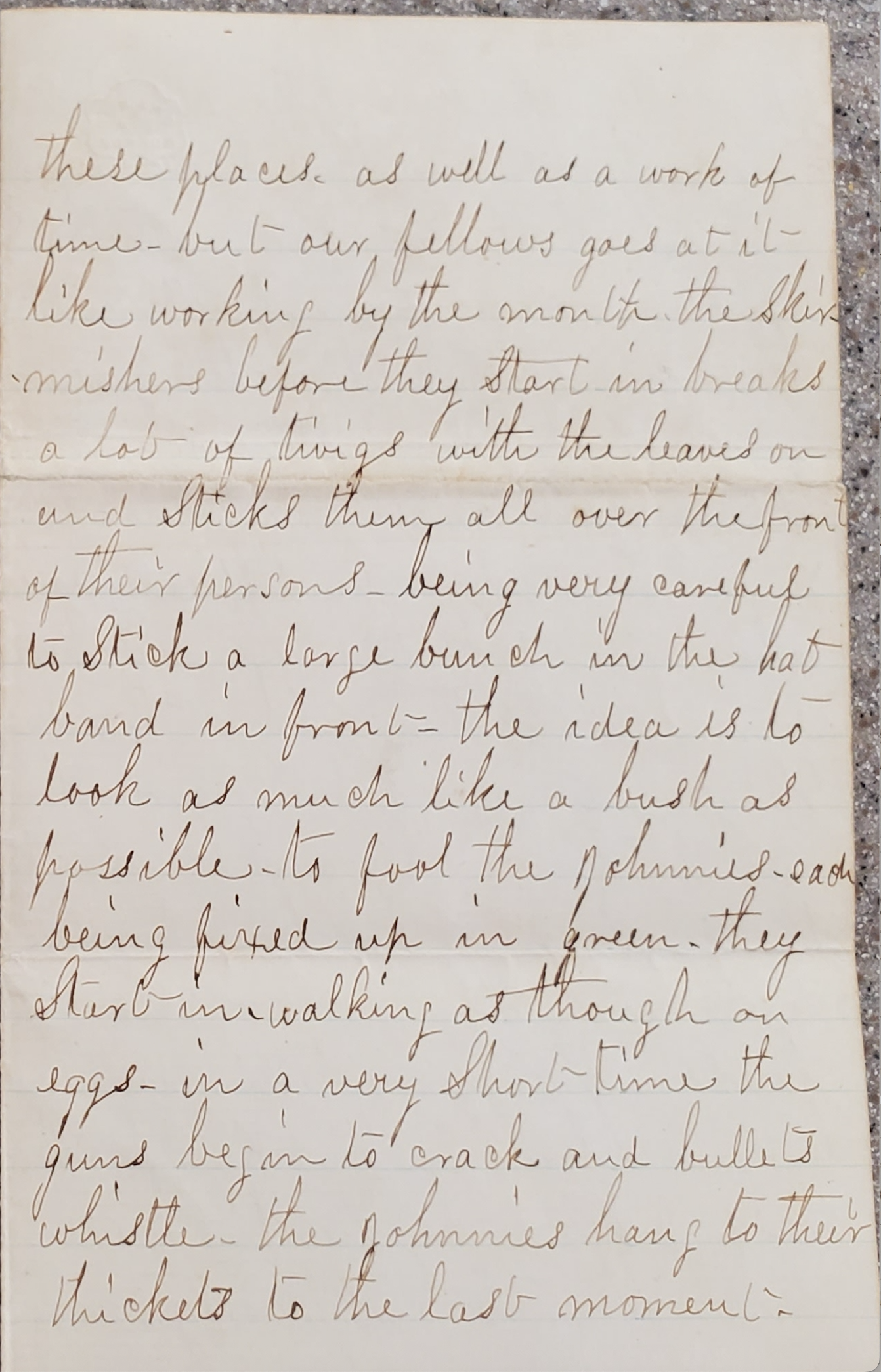 William possessed a noteworthy and engaging style of writing that stood out among soldiers. His expressions were often humorous and unusual. And of all the thousands of Civil War letters I have transcribed, his are the first to document the use of camouflage by Union skirmishers (see letter of June 9, 1864 before Atlanta).