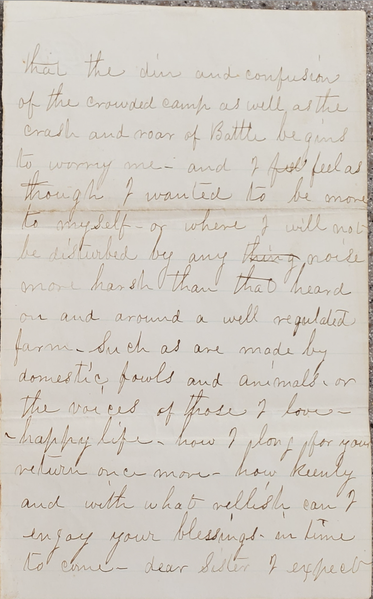 He also asks, “Do you like the service as well as you expected?” Yes, nearly. I expected officers who were men too but as a general thing, they are drunk or cross. Our present Capt. [William Howard] Joyce is an Irishman and when not drunk, he is a kind-hearted, good-natured fellow and looks out for our wants. [end of letter is missing]