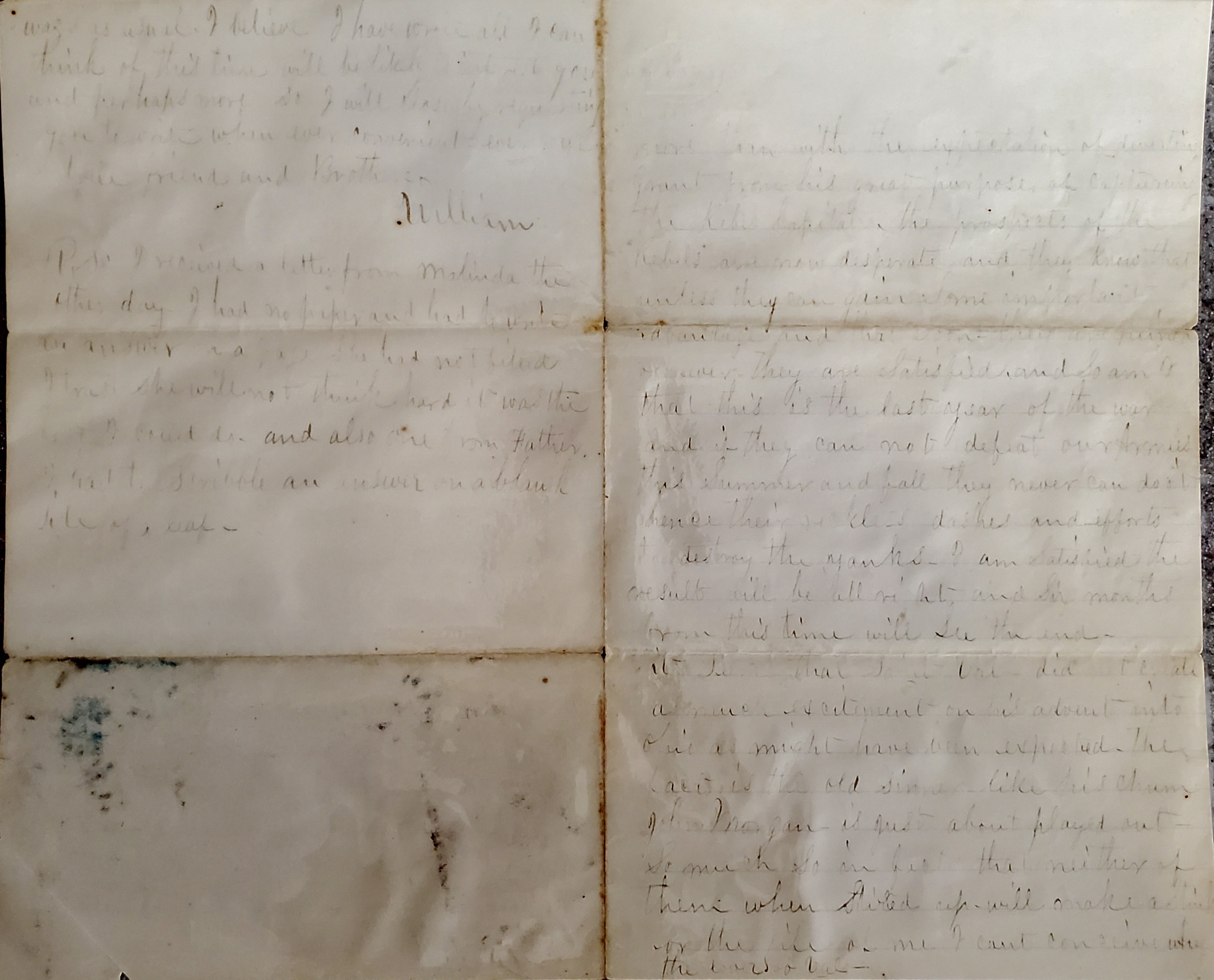 Tell Eva and Allie that I will not write them any letters now but I will beat home some of these days to chat with them. The boys are all well. Nothing more. I remain your affectionate brother, — William