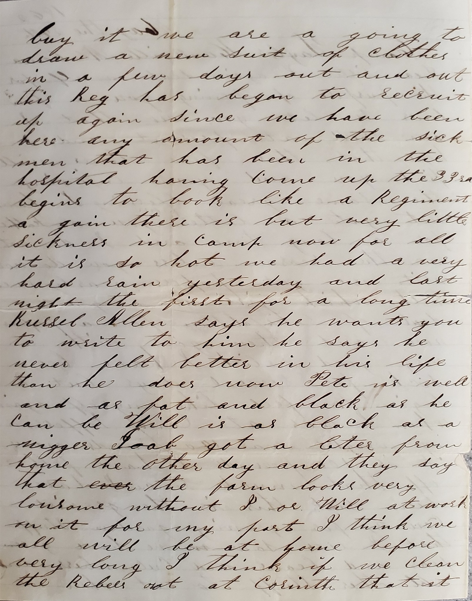 Russell Allen says he wants you to write to him. He says he never felt better in his life than he does now. Pete is well and as fat and black as he can be. Will is as black as a nigger. Joab [Davis] got a letter from home the other day and they say that the farm looks very lonesome without I or Will at work on it. For my part, I think we all will be at home before very long. I think if we clean the Rebels out at Corinth, that it will wind the war up. I am in hopes so anyhow.