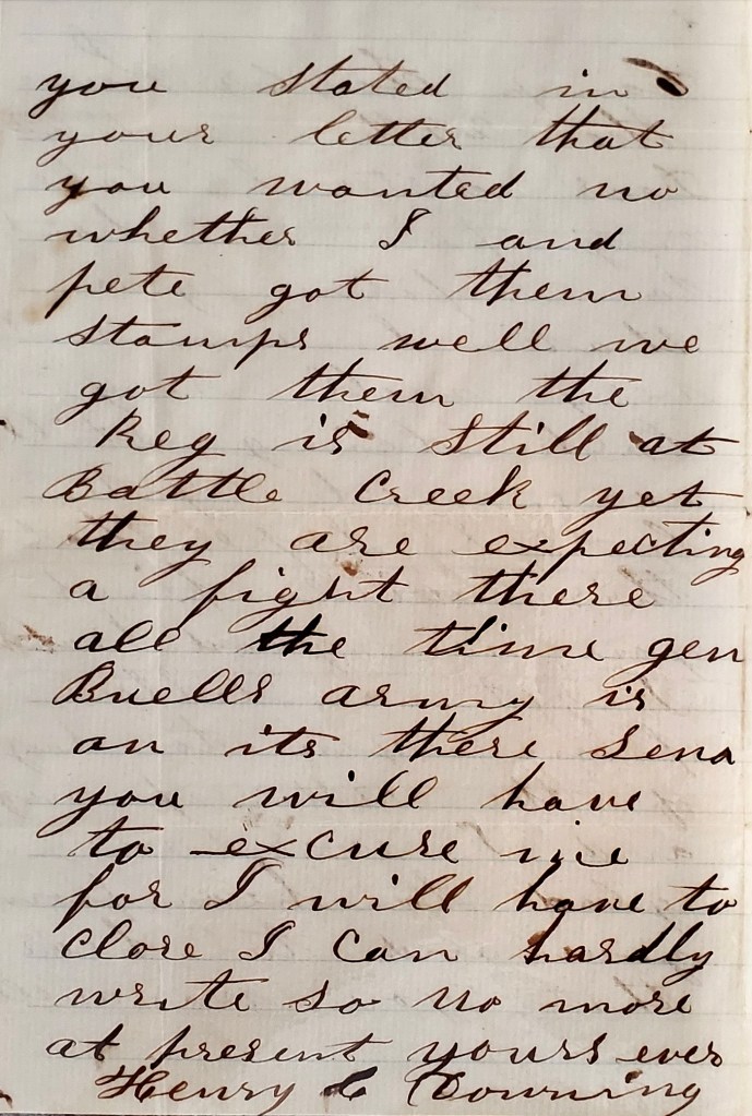 The regiment is still at Battle Creek yet. They are expecting a fight there all the time. Gen. Buell’s army is on its [way] there.