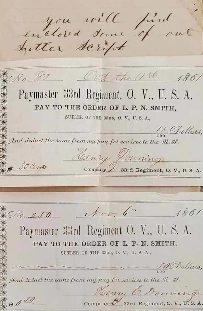The following letters were written by William Washington Downing (1827-1908), the son of Timothy Downing (1801-1887) and Rachel Davis (1803-1883) of Pike county, Ohio. William was 34 years old when he enlisted in Co. D, 33rd Ohio Volunteer Infantry (OVI) in August 1861. Given his maturity, he quickly rose in rank to 1st Sergeant of the company and served in that capacity until August 1864 when he was promoted to 1st Lieutenant of Co. E. He mustered out as a veteran of the regiment and as Captain of Co. E, serving a total of nearly four years. After returning from the war, William relocated to Benton county, Missouri, where he farmed and lived out his days.