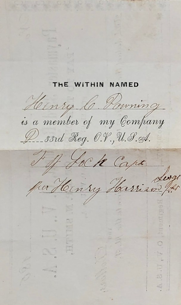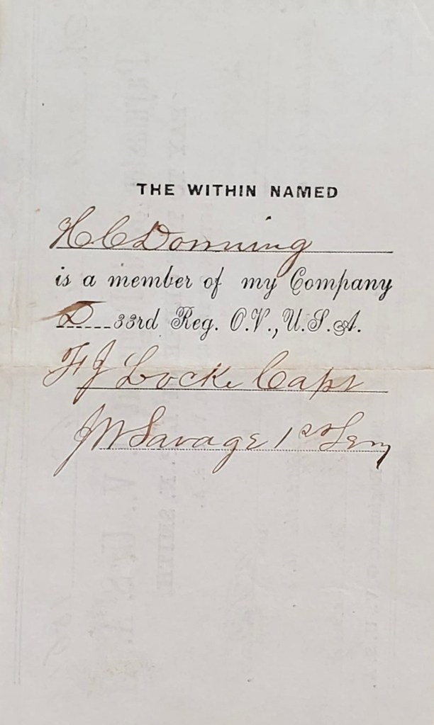 William was twice married. His first wife was Mary Howard (1827-1854). His second wife was Rachel Hooper (1833-1907). A son by his first marriage, Arlington (“Arly”) Leslie Downing (1848-1929) also served in 33rd Ohio with William. He was recruited in and joined Co. D in February 1864 when he was but 16 years old.