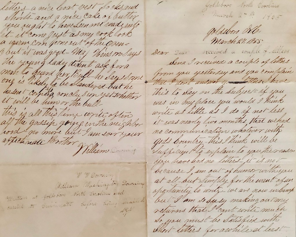 I want you to write and let me know where Matilda is—how she and the children gets along. I have wrote her letters but never received no answer and you nor father never mention her name. I want you to write and let me know how mother is and how she gets along. Tell her that I try to do as she told me. How Arly does and whether he has got any new clothes or not. I must bring my letter to a close so no more at present but ever [remain] your affectionate brother, — Henry C. Downing.