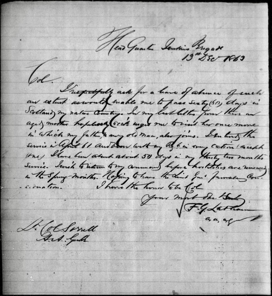 I respectfully ask for a leave of absence of such as extent as would enable me to pass sixty (60) days in Scotland, my native country. In my last letter from there an aged mother hopelessly sick urges me to visit her once more in which my father, a very old man, also joins. I entered the service in April 61 and been with my regiment in every action (except one). I have been absent about 50 days in my thirty-two months service. I wish to return to my command before hostilities are renewed in the Spring months.