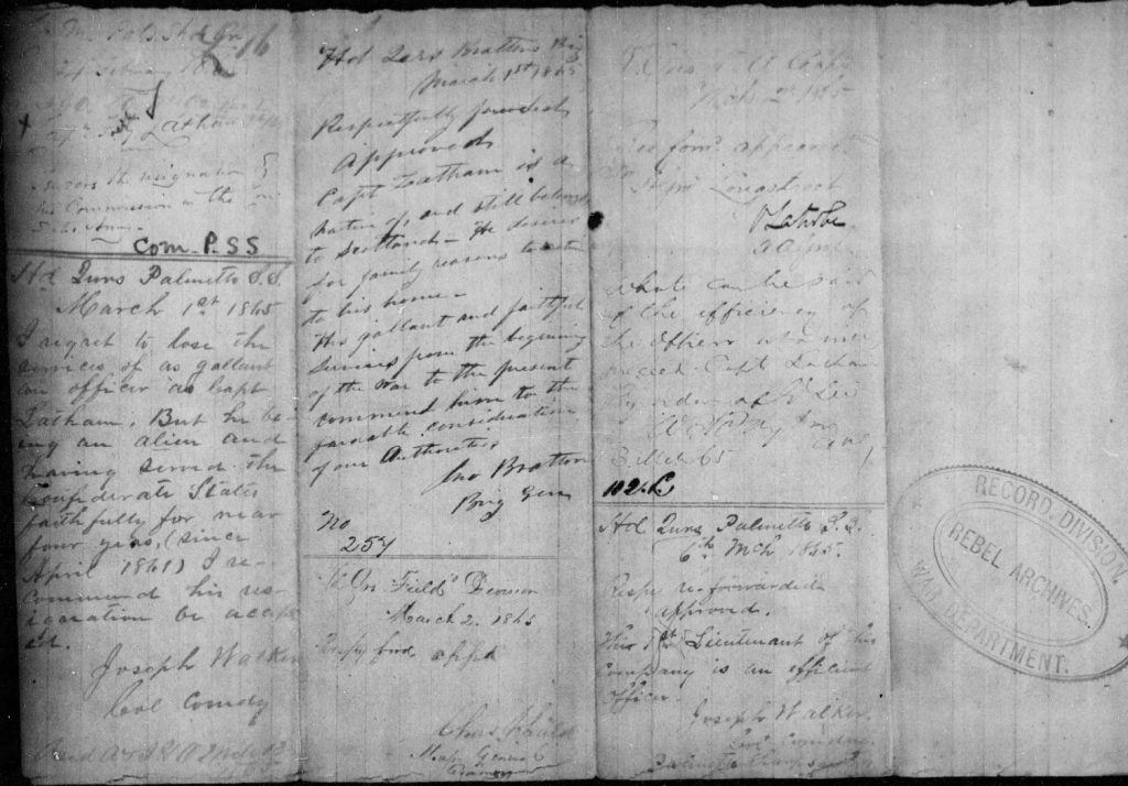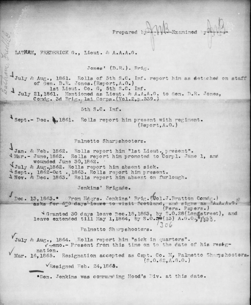 F. G. Latham’s Service Record in Co. M, Palmetto Sharpshooters (Fold 3)