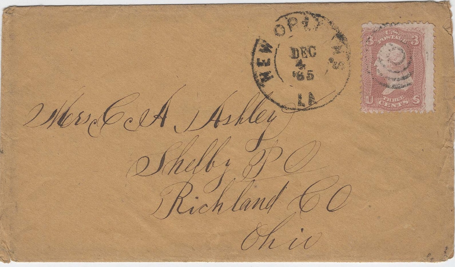 Mrs. C. A. Ashley, Shelby P. O., Richland county, Ohio (Envelope bears a New Orleans, La., December 1865 postmark so is not accurately paired with this letter)