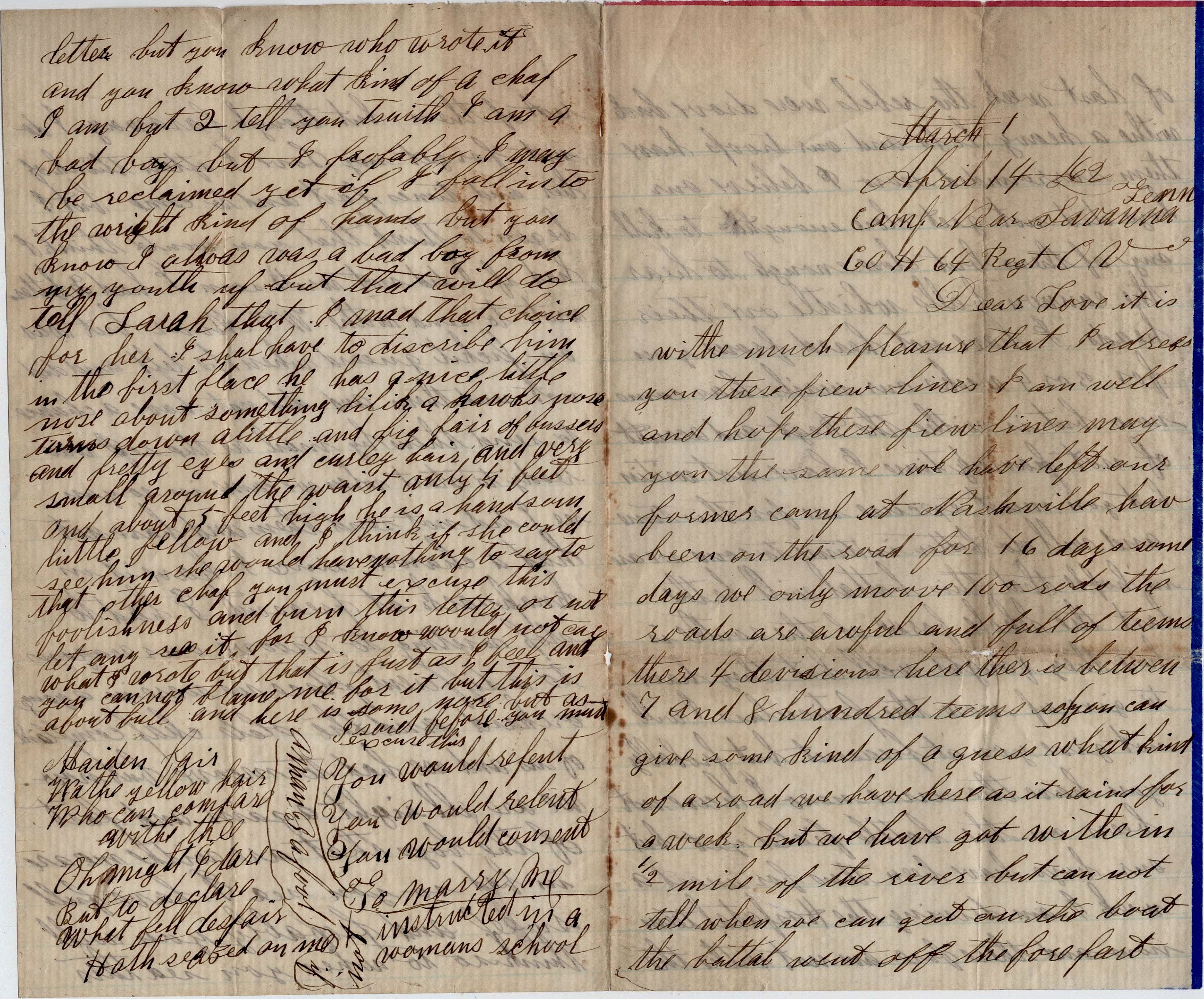 James is well. He was on picket at Mooresville. They said that the town was full of girls but all secesh. But they would not marry till we stopped fighting. Then I think we can make union, but I would rather have one that’s already Union—the one that lives in Ohio near Old George Bloom’s across the woods. Dear, I remain the same to you as ever and remember [me] as your lover.
