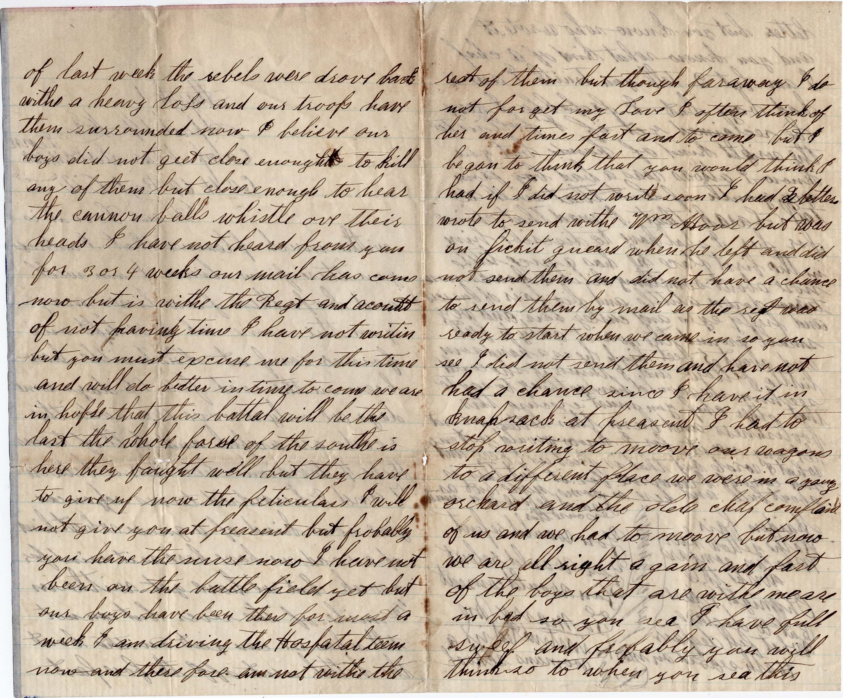 Dear wife, I am in very good health and I hope that you are the same. And I think of you from hour to hour. Darling, you do not know how a true man does love his wife, yet he loves her better than himself. Oh, I did see 50 men at least wounded and nearly dead. All they pray for is, “Oh God, bless my dear wife.” They do not think about themselves. It does me good to see it. There is nothing in the world that is so dear to me than my little wife. Darling, goodbye. I have to close. Write soon and I hope we will meet soon again.