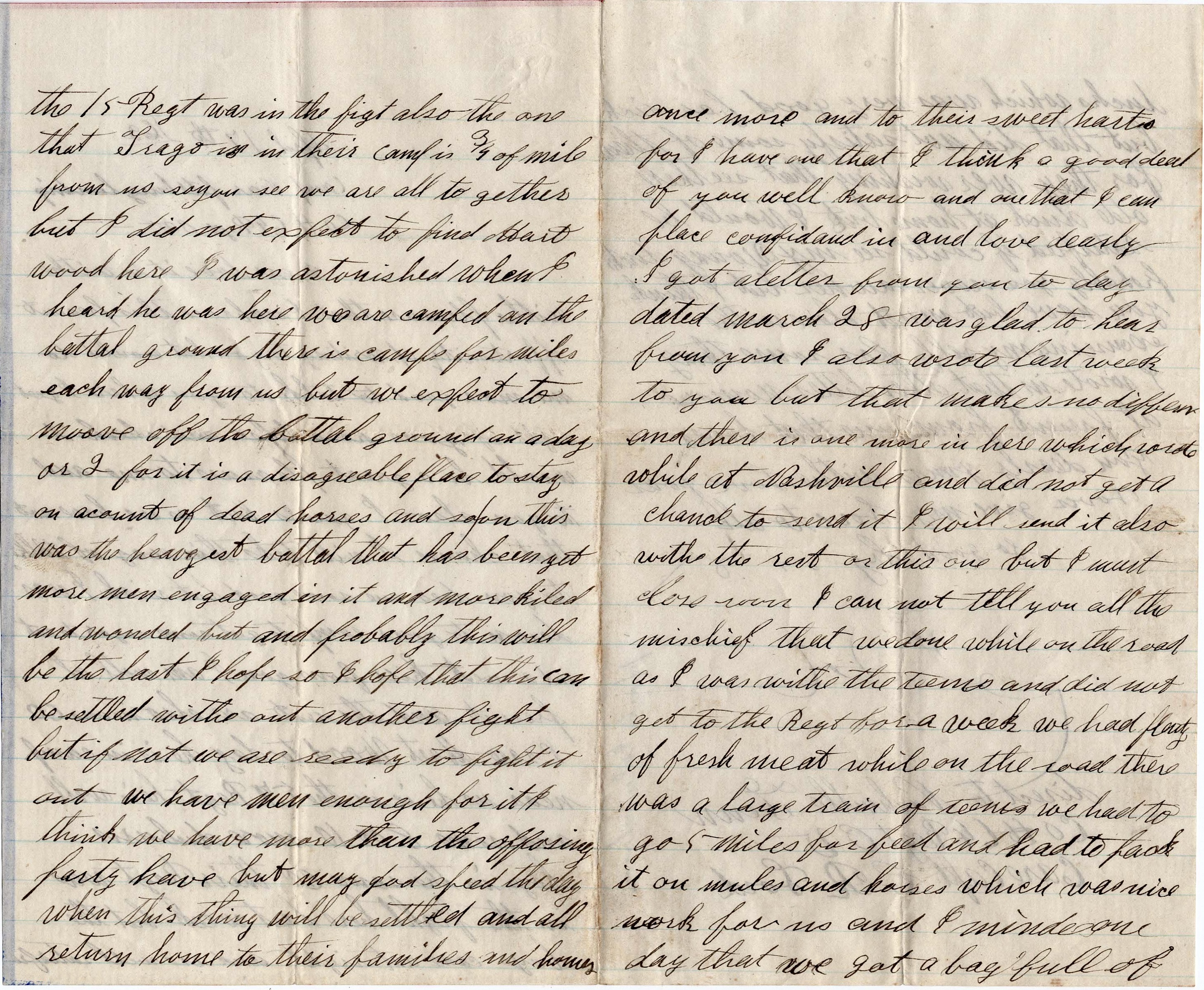 We are camped on the battleground. There is camps for miles each way from us. But we expect to move off the battle ground in a day or two for it is a disagreeable place to stay on account of dead horses and so on. This was the heaviest battle that has been yet. More men engaged in it and more killed and wounded. But probably this will be the last. I hope so. I hope that this can be settled without another fight. But if not, we are ready to fight it out. We have men enough for it, I think. We have more than the opposing party have. But may God speed the day when this thing will be settled and all return home to their families and homes once more. And to their sweethearts, for I have one that I think a good deal of, you well know, and one that I can place confidence in adn love dearly.
