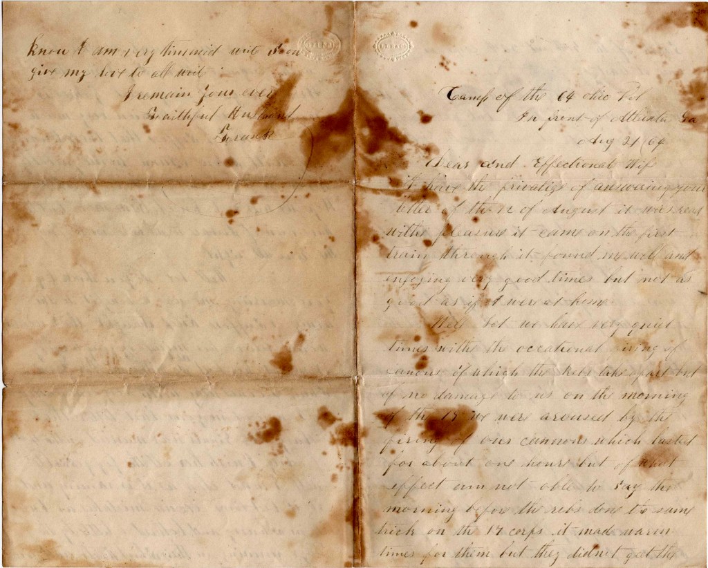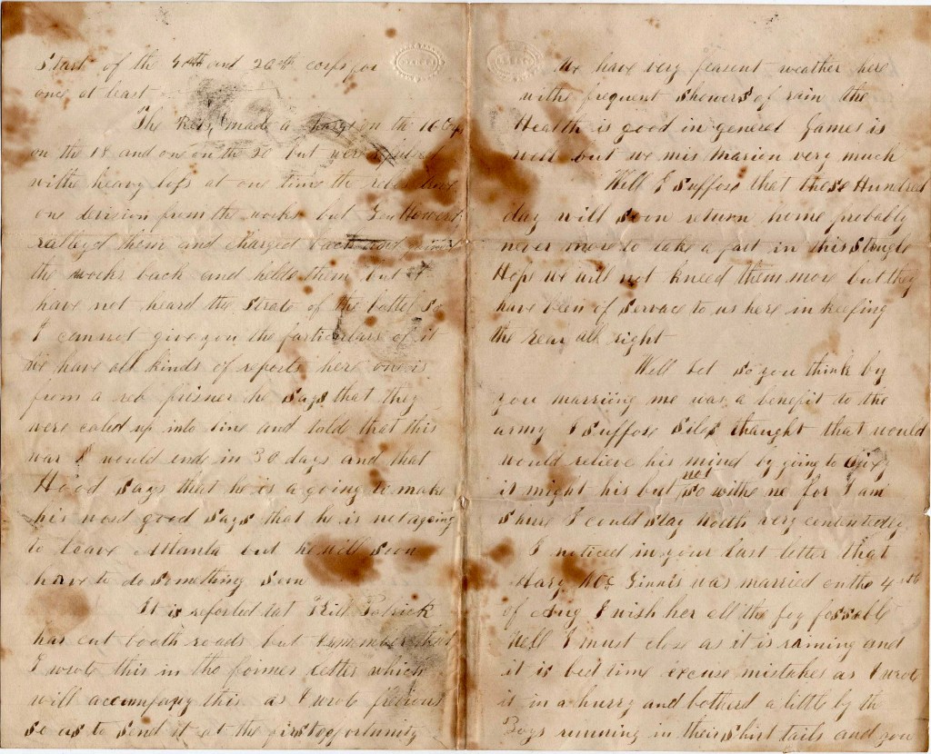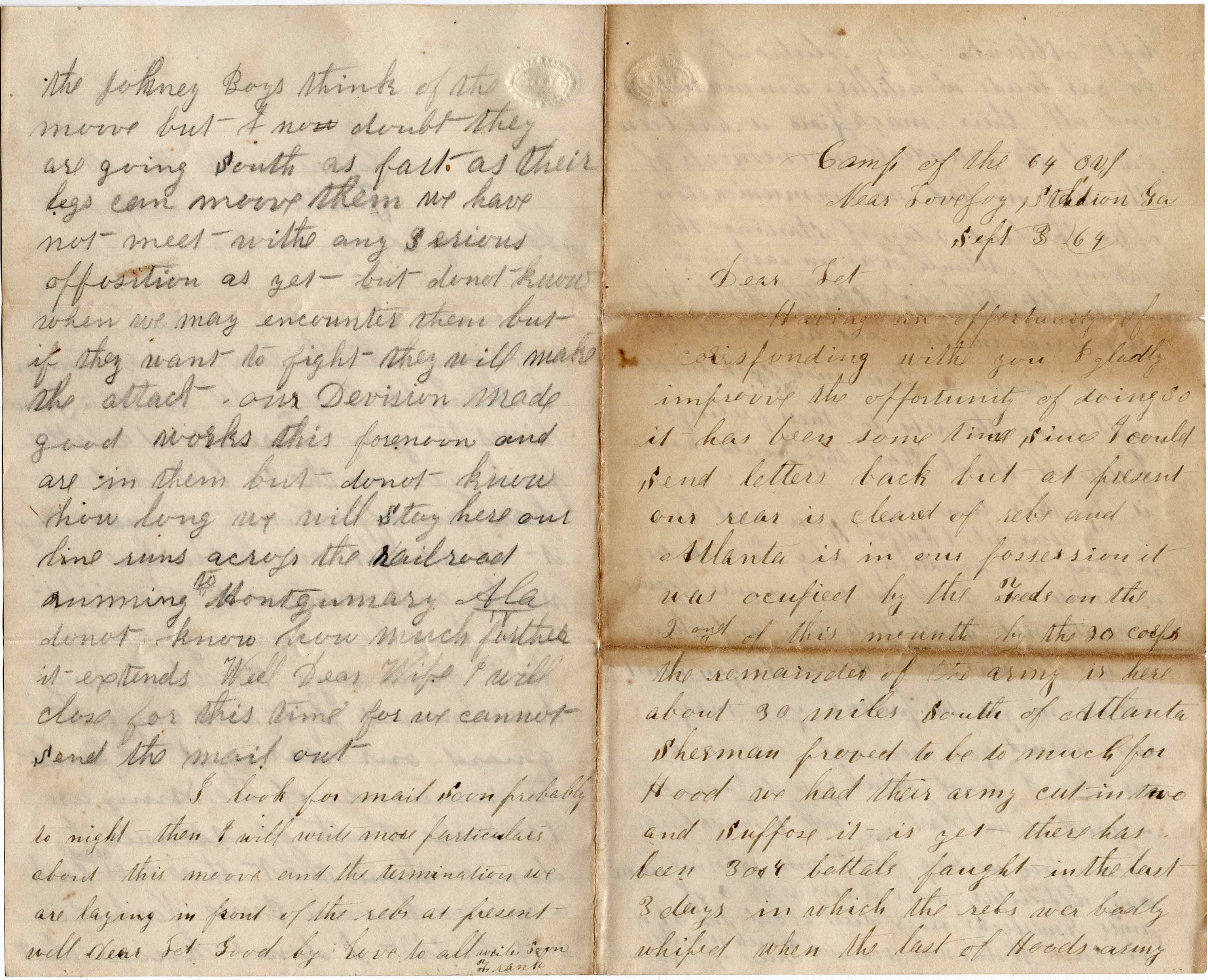 I received your kind letter sent by that young man on the 29th of August, and was very glad to hear that you are in good health and I thank God that I can tell you the same. Darling, I live in hopes we will be soon together again. This war must close soon. It is going to the end and if it don’t, I will try to finish it myself. I will try very hard to get my discharge on the 17th of September. If I get it, I will come home. It may be that we come back to Mobile as soon as this campaign is over, if the Yankees don’t take Atlanta.