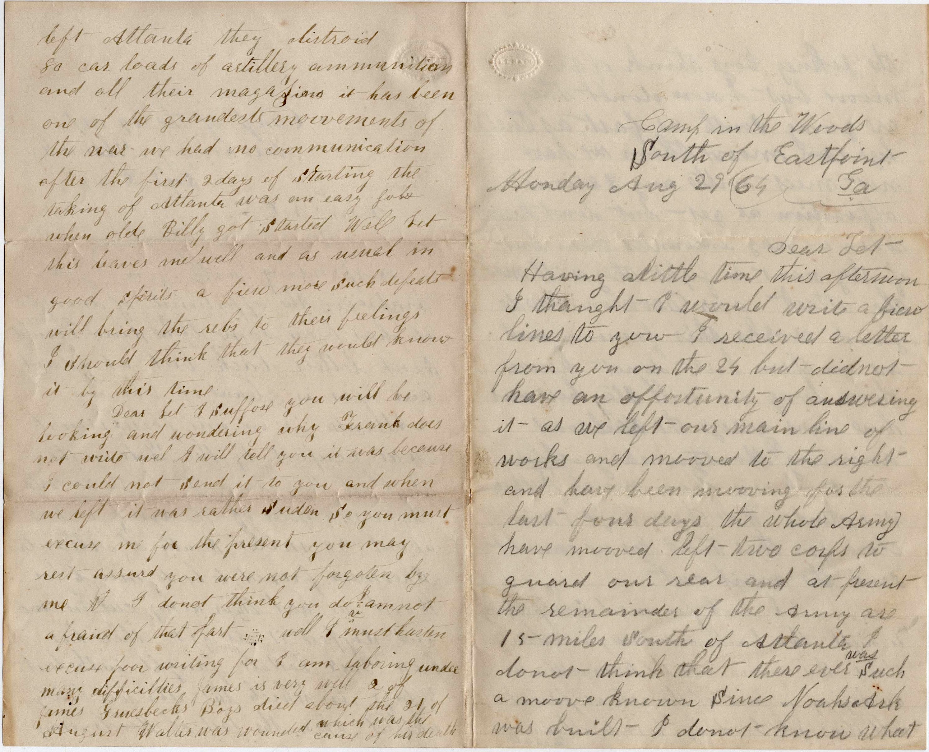Camp in the Woods, South of Eastpoint, Ga. Monday, August 29, 1864