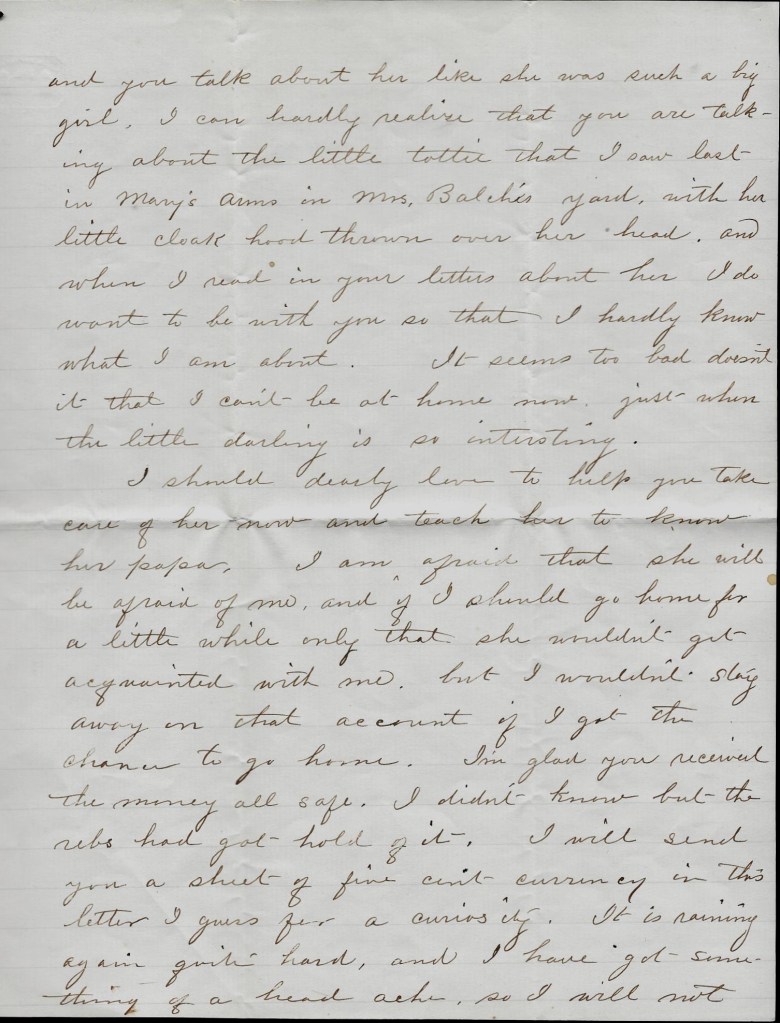 My daughter does not live at home. She is 12 miles from here going to school and bids fair to make a very intelligent girl. She is boarding at a Mr. Brown’s house—the pastor of the Stone Church (an Old [School] Presbyterian known here by that name) in Misses Brown’s care who superintends the school. She comes home to see us sometimes. The people are generally well with the exception of the measles. They have proved very fatal here this summer. A good many people have died with them and they are still raging. I think they are more than the common measles.