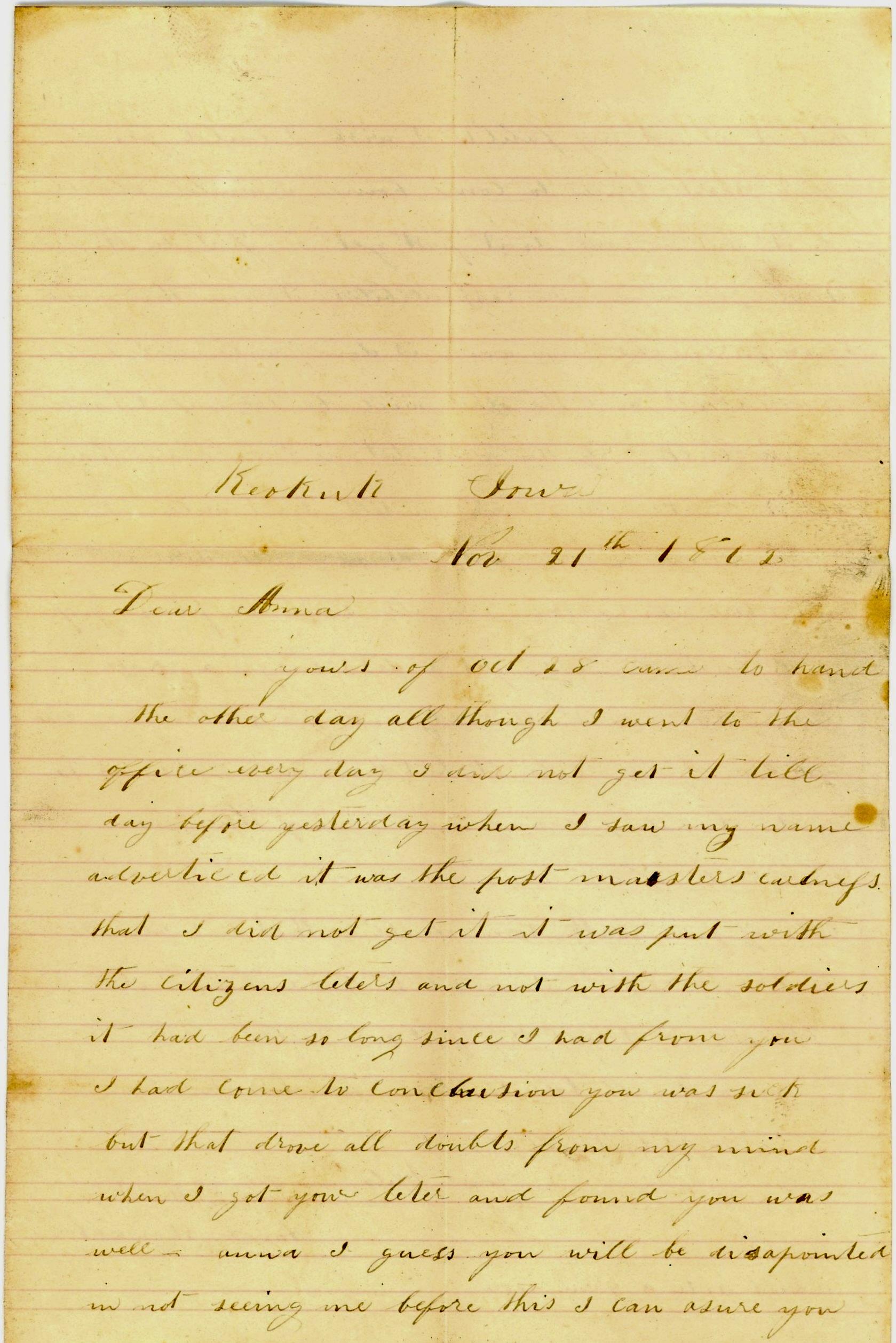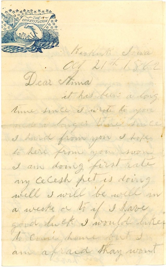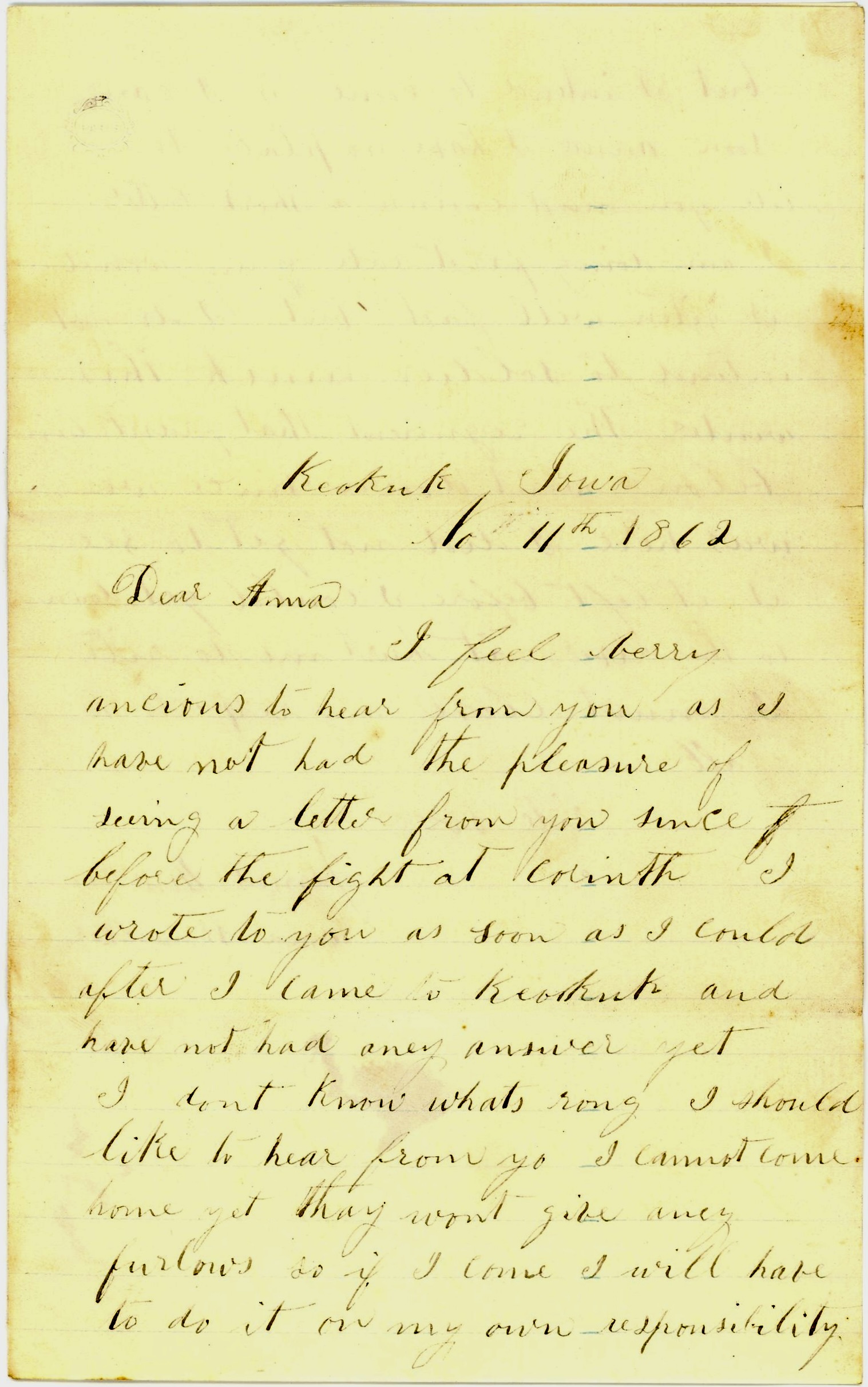 I feel very anxious to hear from you as I have not had the pleasure of seeing a letter from you since before the fight at Corinth. I wrote to you as soon as I could after I came to Keokuk and have not had any answer yet. I don’t know what’s wrong. I should like to hear from you. I cannot come home yet. They won’t give any furloughs so if I come, I will have to do it on my own responsibility. But I intend to come if I can soon.